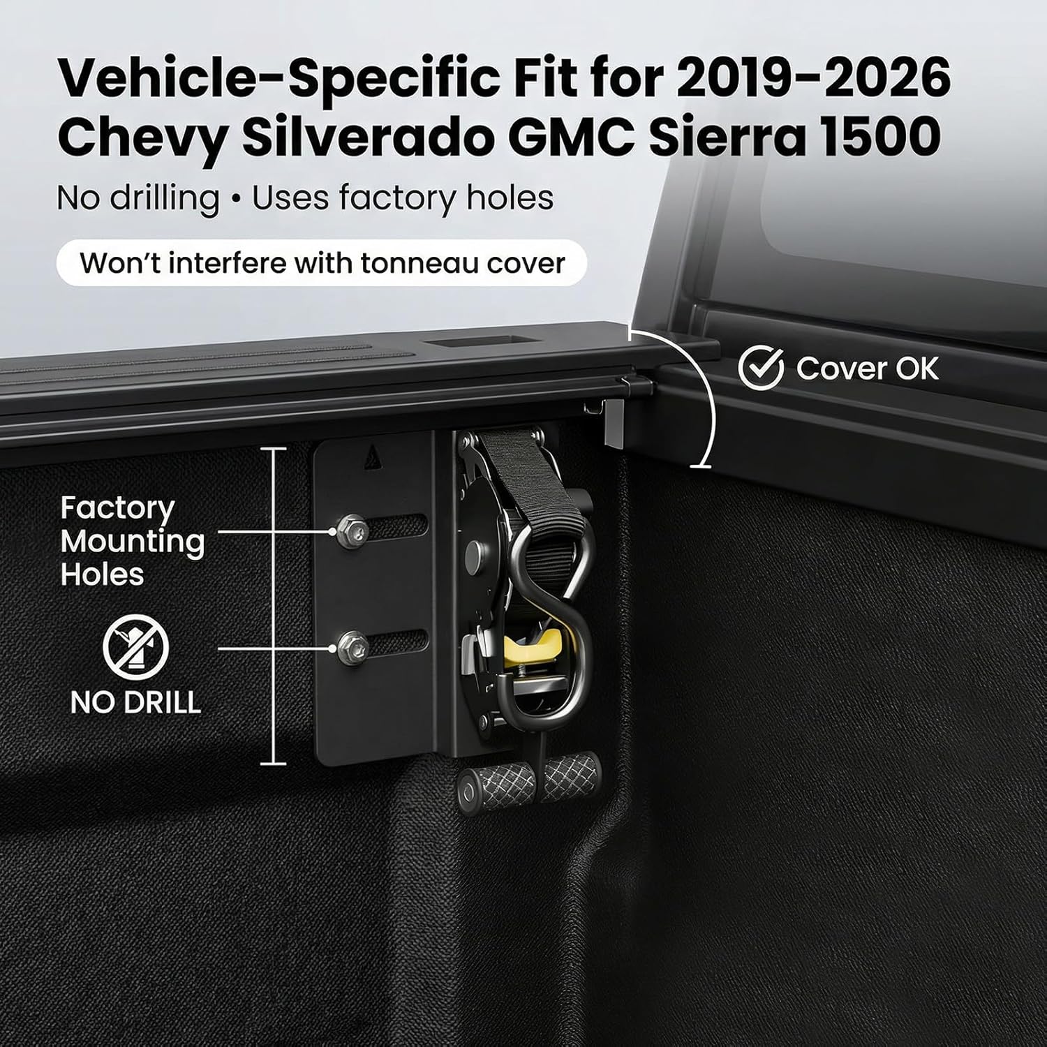 • 【Applicability】This retractable ratchet straps is compatible with 2019-2026 Chevy Silverado GMC Sierra 1500. It's designed based on the original vehicle model. Please confirm your car year and model before purchasing.