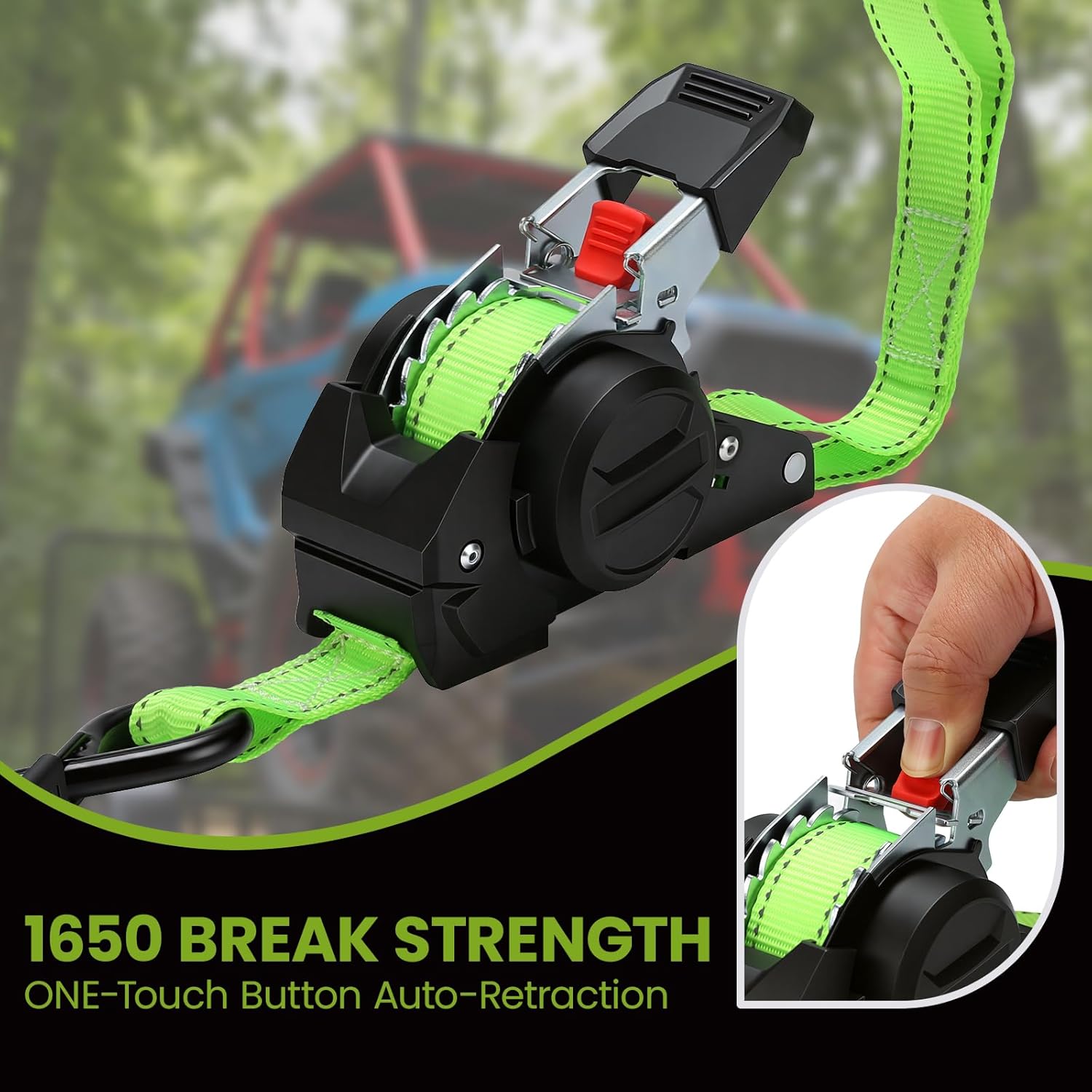 Description Solimeta Auto Self-Retracting Ratchet Straps (1" x 10', 1,650lb Break Strength) - 4-Pack Green Tie Down Straps for Trucks, Trailers, Motorcycles, ATVs & UTVs Heavy-Duty Retracting Ratchet Straps: 4-pack green set with reflective strips, 550lbs working load limit, 1650lbs break strength. Built tough for long-lasting use. Complete Tie Down Straps Kit: Includes 4 retractable ratchet straps, 4 loop straps, and 1 storage bag for easy organization. Versatile Tie Down Straps: Secure motorcycles, ATVs, UTVs, and general cargo with reliable hold during truck/trailer transport. Auto-Retracting Ratchet Straps: One-hand operation cuts packing time, making cargo securing hassle-free and efficient. Enhanced Safety: Reflective strips on retracting ratchet straps enable quick low-light identification, boosting nighttime visibility.