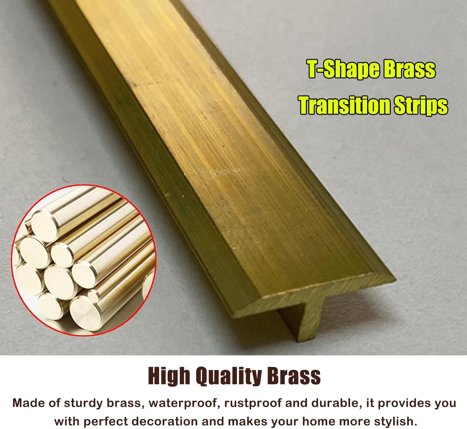 - **Material:** Brass- **Width:** 15mm (0.59in)- **Length:** 100 cm (39 3/8in)- **Load Bearing:** 300 kg (660 lbs)**Features:**- Crafted from sturdy and durable brass for long-lasting performance.- Perfect for enhancing floor aesthetics while providing a secure transition between adjoining surfaces.- Designed for closing, sealing, and decorating edges of floors, carpets, and laminates.- Versatile for various applications, ensuring a polished finish in multiple settings.**Package Contents:**- 1 x Floor Transition Strip**Warm Reminder:**- Please note that manual measurements may result in a 1-2 cm variance based on the actual size.- Color discrepancies may occur between the product images and the actual item due to variations in screen brightness and lighting.**Good Service:**- Should you have any questions regarding the product, feel free to contact us at any time. Our dedicated customer service team is available 24/7 to assist you.