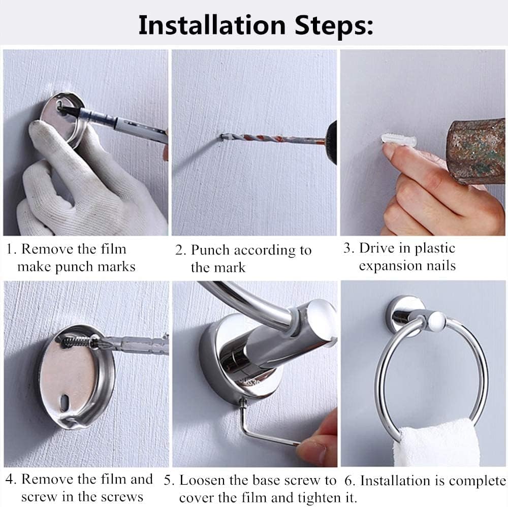 GOOD DESIGN: Contemporary Style, aesthetic and well-designed. Balanced Rotation without Squeaking Elastic rubber connects to the two sides of the towel ring, has a specific resistance, so our towel ring won't touch the wall because of extreme pulling. Modern Towel Ring Stylish round shape offers a smooth tasteful for an engaging yet significant, gives better extra room to towels without puncturing them. User Friendly, Stay Cleaning It is easy to grab the towel when you clean up, simple to clean, simple to allow the towel to dry normally. SPECIFICATIONS: Material: Stainless Steel Finish: Brushed Nickel(Polished) Installation Method: Wall-mounted PACKAGE INCLUDES - 1 x Towel Ring - 1 x Bag of stainless steel screws - 1 x User Manual for Installation instructions steps Step 1:Drill two holes on the wall. Step 2:Use hammer hit the anchor into holes. Step 3:Use screwdriver to fix the bracket on wall. Step 4:Fix product to the bracket, tighten the set screw. The ALAMANIA Bathroom Towel Ring acts as a subtle accent that complements surrounding decor, Designed to match the series of trims, SAFE. Wall mounting design protects against water , really convenient and useful. Installation tips: Please ensure the surface of the wall be smooth. Choose from a stylish chrome finish and a warm brushed nickel finish. The ALAMANIA Towel Ring offers simple, subtle design to complement your bathroom motif. Featuring a low-key yet stylish appearance, this towel ring for bathrooms effortlessly matches with the rest of the accessories for a clean and unassuming style in your home. This towel ring is available in a mirror-like chrome finish or SpotResist brushed nickel finish that resists fingerprints and water spots to keep your home looking cleaner. INSTRUCTION MANUAL INSIDE