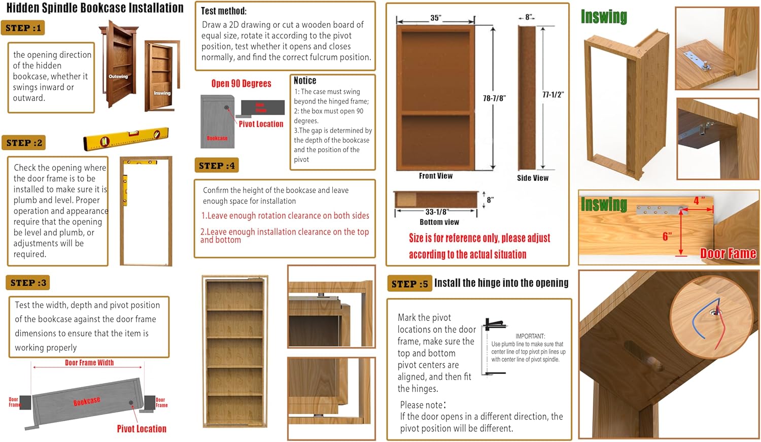 • Two installation ways:You can install our hidden door hinge as outswing door or inswing door according to your needs for your hidden bookshelf door