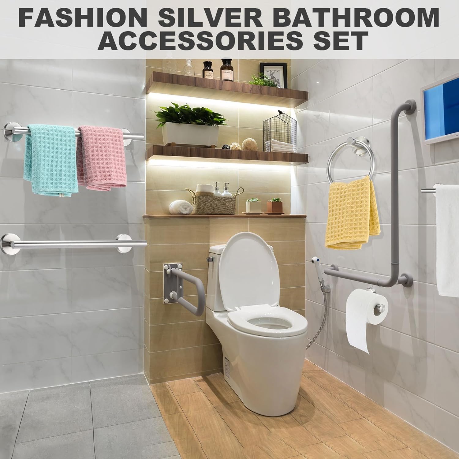Features: Safe design: The bathroom accessory set are designed with clean lines and sturdy construction. Elegant shape and concealed mounting hole make it Beautiful and sturdy. We polished square corner of the product into an arc shape to make sure the holder not easy to scratch your body in daily use. Wide application: Matte black bathroom hardware set is a nice way to hang and store bathrobes, bath towels, towels, toilet paper, swimwear and more. Toilet paper and towel holder is suitable for bathroom, kitchen, laundry and more places to keep your towels organized. Warm note: The black bathroom towel holder comes with foam packaging, which can effectively prevent the towel holder from being bumped or worn during transportation. Specifications: Material: SUS304 stainless steel Color: silver Size: as the picture shown Package includes: 5x 16 inches towel bar 5 x Toilet paper holder 5 x Towel ring 10 x Robe and towel hooks 10 x Adhesive hooks Notes: Manual measurement, please allow slight errors on size. The color may exist a slight difference due to different screen displays.