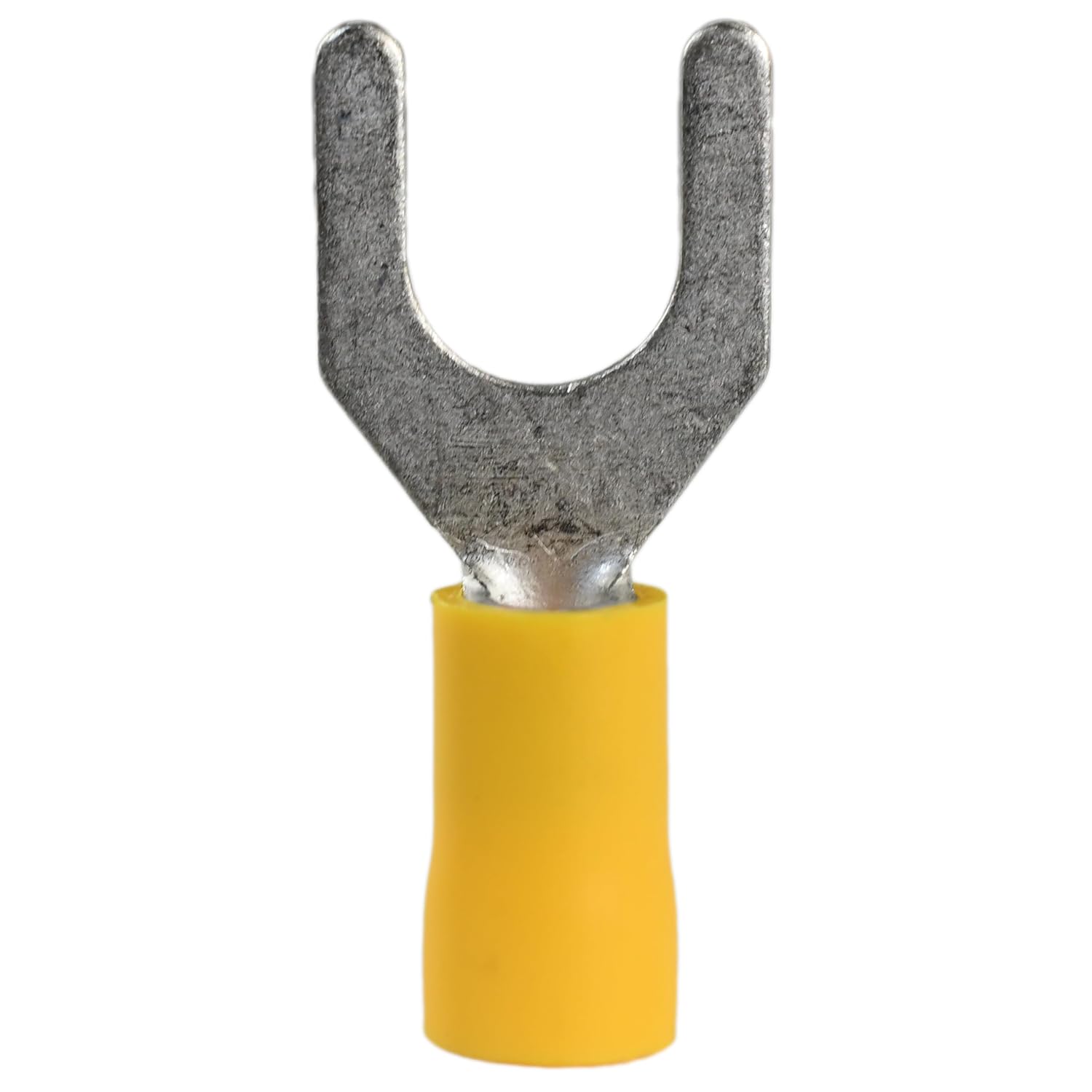 PAPUGA 12–10 AWG Insulated Fork (Spade) Crimp ConnectorElectrical Rating: 600V / 48A Max | Certification: UL & cUL Listed – File E357535Bolt Size: 5/16" / M8This 12–10 AWG insulated fork connector is designed for secure, high-current electrical connections in automotive, marine, industrial, and power-distribution applications. The fork design allows installation without fully removing the screw or bolt.Manufactured from Tin-Plated Copper, this connector provides excellent electrical conductivity and corrosion resistance. Designed for use with 12–10 AWG stranded copper wire only and rated for up to 48A at 600V when properly crimped.Crimping Instructions: Use a crimping tool designed for insulated terminals. The PVC insulation may be removed if required, but a bare-terminal crimper must then be used. Always perform a pull test after crimping.Fit & Installation Note: Before ordering, confirm the selected wire gauge and connection size match your application. Designed for stranded copper wire and proper crimping tools only.✔ FIT & USE CONFIRMATION Matches the selected wire gauge and connector size shown above Designed for stranded wire and proper crimping tools Disconnect power before installation for safety