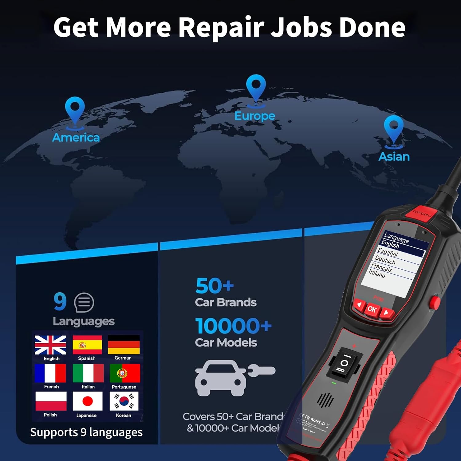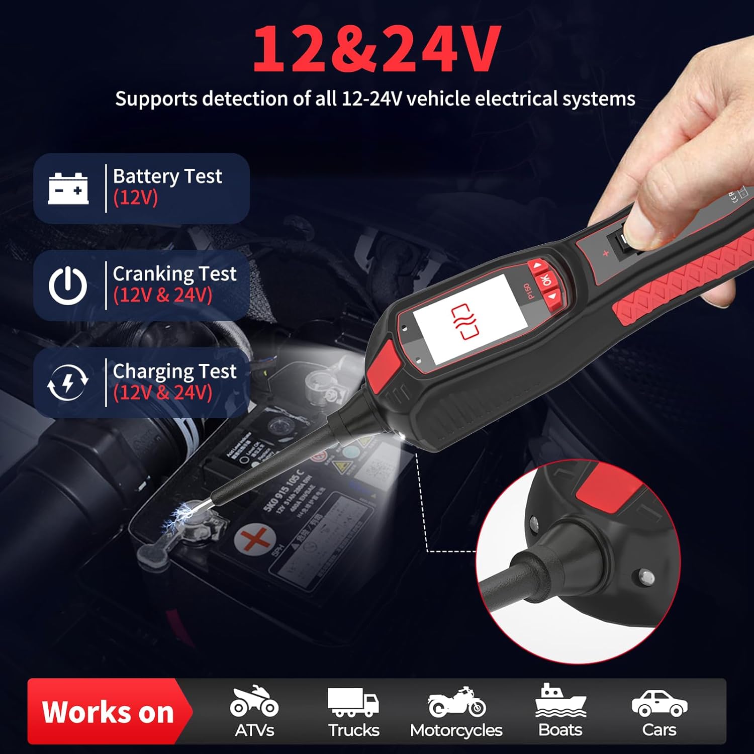 Upgrade your vehicle electrical diagnosis with our professional-grade multifunctional automotive electrical tester, designed for 6-30V vehicles to simplify the diagnostic process for both professional mechanics and passionate DIYers by combining accuracy, safety, and ease of use—this one-stop solution covers all your vehicle electrical needs, including accurate measurement of DC voltage (0.1-70V, ≤1% error), AC voltage, resistance (0.1Ω-200KΩ, ≤1.5% error for ≤100KΩ), and diode forward voltage drop (0.2V-2.6V), as well as detection of signal frequency (10HZ-200KHZ) and duty cycle (1-99%) ideal for testing sensors and fuel injectors, plus continuity checks and short circuit tracing to locate faults without repeated fuse replacement; featuring intelligent testing mode that automatically recognizes measurement types to save time, a bright TFT color display showing real-time results (including max/min values), red/green polarity LEDs for instant circuit polarity feedback, audible alerts (with on/off option), ergonomic navigation buttons, and an LED work light for visibility in dark engine bays or low-light conditions, it prioritizes safety with a built-in circuit breaker for overcurrent protection (trip current: 8Amps/1hr, 12Amps/<1hr, 16Amps/<5sec), insulated probe and ground clamp, and compatibility with safe operation in well-ventilated areas around ignition coils and hot engine parts; versatile enough to test trailer lights, activate interior components, check ground contacts, and diagnose sensor circuits, it boasts a compact (1654027mm) and robust design that withstands professional use, operates in temperatures from 0-60°C (32-140°F) and stores safely from -40-70°C (-40-158°F), powers directly from the vehicle battery (12V or 24V) without extra batteries, and supports multi-language interfaces (English, Spanish, German, French, etc.) for global accessibility—this high-quality tester simplifies diagnosis, saves repair time, ensures accurate results, and comes with a one-year warranty for quality assurance, making it a must-have tool for anyone working on vehicle electrical systems, delivering professional performance without the professional price tag (note: always read the user manual carefully and follow all safety precautions to prevent personal injury or vehicle damage).