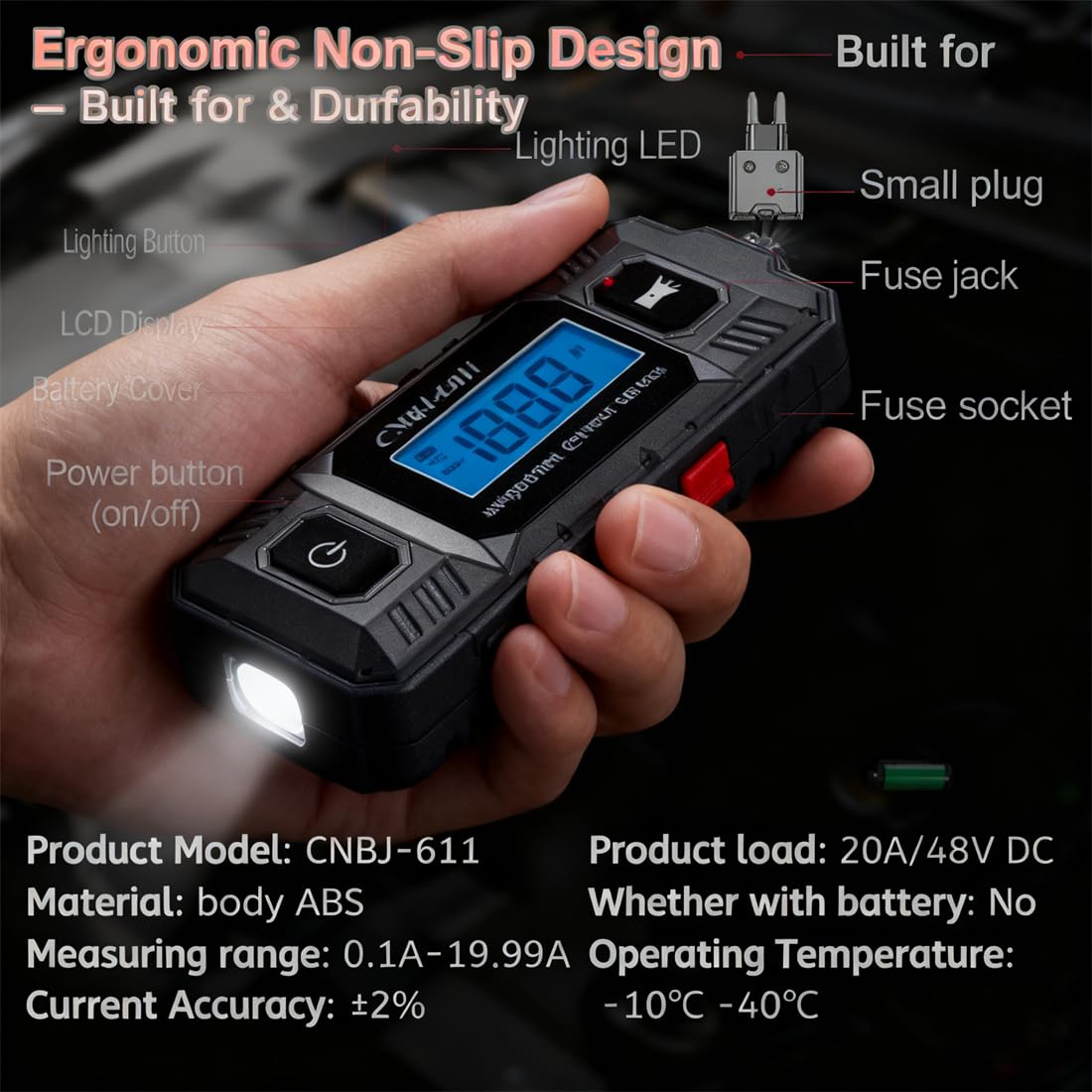 -------------------------------Welcome to our shop-----------------------------Automotive Circuit Fault Probe Tester, Portable High-Precision Current Tester, 20A 48V Wire Tracer with LED Display and Lighting, Automotive Open & Short Finder, Car Relay Fuse Blade CheckerWhat's so special about Automotive Circuit Fault Probe Tester?Feature:High-precision readings ensure accurate diagnosisBuilt-in LED light illuminates dark workspacesClear LCD backlight for easy data visibilityDurable ABS body with ergonomic non-slip gripPowered by 23A battery for long testing sessionsWorks with cars, trucks, and various vehiclesCompact, portable design for quick diagnosticsSpecifications:Name: Automotive circuit fault probe testerMaterial: ABS/PCCategory: Circuit TestersMeasuring Range: 0.01A-19.99ACurrent Accuracy: ±2%Load Capacity: 20A/48VDCSize: 4.33 * 1.77 * 1.18 inchesColor: BluePackage Includes:1 Set Automotive Circuit Fault Probe Tester1 Pair of GlovesNote:Due to manual measurements, please allow slight measurement deviations.Due to the different display and lighting effects, the actual color of the item may be slightly different from the color displayed on the picture.