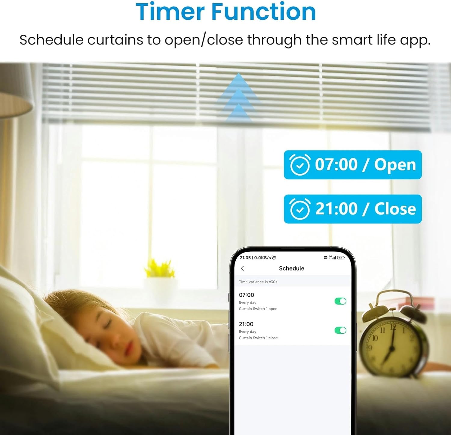 - Set up lights according to the time of day to guide you in the dark night.- Support Smart Life APP /Tuya APP.- Mobile app remote control to open or close curtain.Manual control of the device through the glass touch panel for safe operation with wet hands.Group control of devices and sharing of devices with family members.You can set a timer to open or close the curtains at a specified time.With Smart Life scene settings, you can flexibly set your curtain status according to sunrise, sunset or weather conditions.Max Load: 600WWireless Protocol: 2.4GHz Wi-Fi(not support 5GHz Wi-Fi)Standby Consumption: below 0.5WColour: White/BlackCompatible with: Tubular Motor with 4 wires