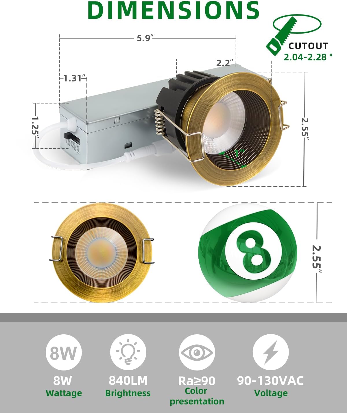 | Included Components | The product package includes the 2 inch light fixture, junction box, 4-hole quick wire connector, user manual, and a 1:1 cutout template. |