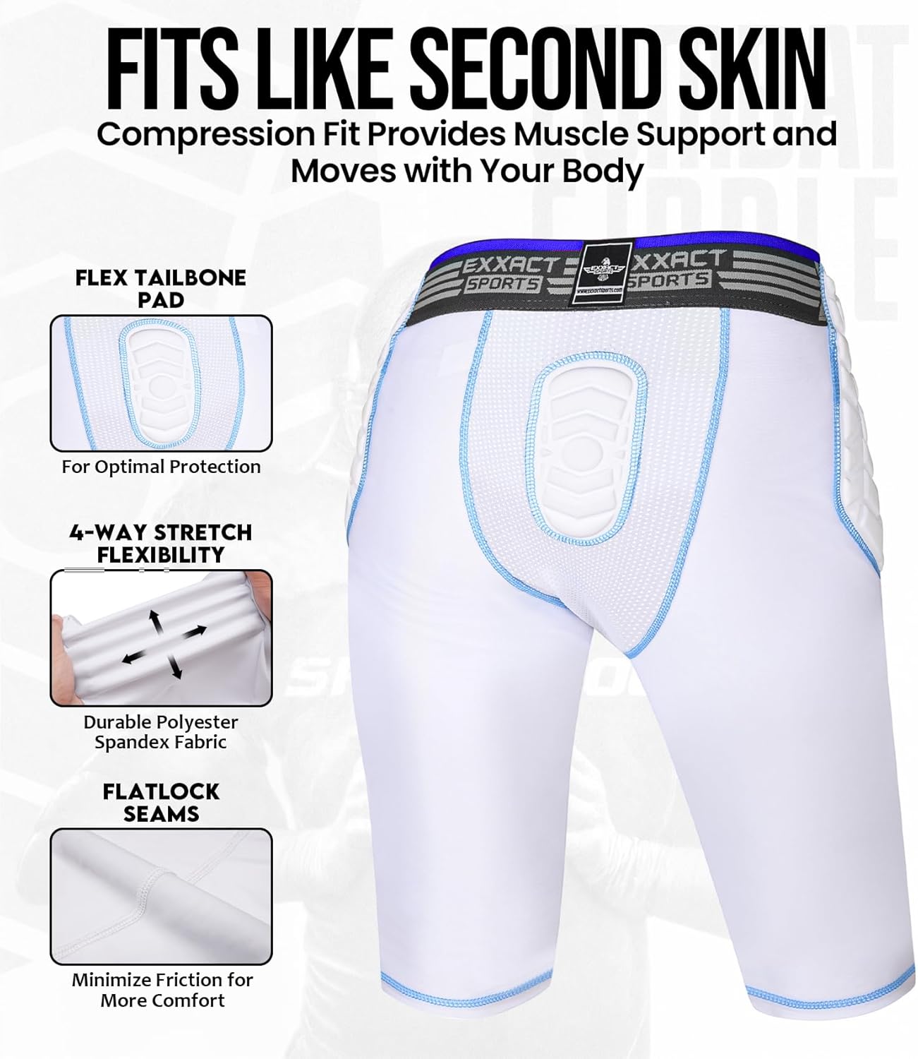 CRUSH THE COMPETITION WITH UNSTOPPABLE PROTECTION - COMBAT 7-PAD FOOTBALL GIRDLE Exxact Sports professional-grade protective gear delivers the confidence you need to play harder and faster on every down. Designed with player safety as the top priority, our football girdles features strategically placed 12 mm EVA pads that shield your most vulnerable areas - hips, thighs, knees, and tailbone - from the hard hits. The flexible padding moves with you, providing protection even in the most dynamic plays. Our premium polyester and spandex blend provides a 4-way stretch compression fit that supports critical muscle groups while allowing complete freedom of movement. The soft elastic lining offers a secure fit that won't ride up or require constant adjustment, allowing you to maintain complete focus on your performance. A built-in cup pocket provides additional protection, while the ventilated mesh and sweat-wicking technology keep you cool, dry, and odor-free. Order your Combat football girdle with knee pads today and experience the difference that professional-grade protection makes on the field.