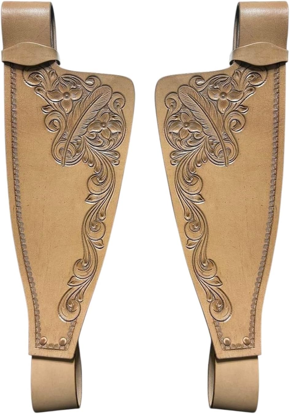 Upgrade your Western saddle with the Majestic Ally Tooled Leather Western Saddle Fenders – expertly handcrafted for quality, durability, and Western elegance. This set of 2 replacement fenders is made from premium leather and features three distinct floral tooling options to suit your personal style: ✔ Feather Bloom – with a soft petal and swirl pattern ✔ Classic Scroll – a traditional floral scrollwork design ✔ Vintage Rose – deep floral carving with a rich tone Each tooling style is paired with a unique color tone – Natural Tan, Light Oil, or Deep Chestnut Brown – giving you a wide choice under one convenient listing. Compatible with most Western saddles, these fenders offer a perfect replacement or stylish upgrade for ranch work, trail riding, barrel racing, or show. Whether you're a casual rider or a working cowboy, this versatile set adds functionality and flair to your tack.