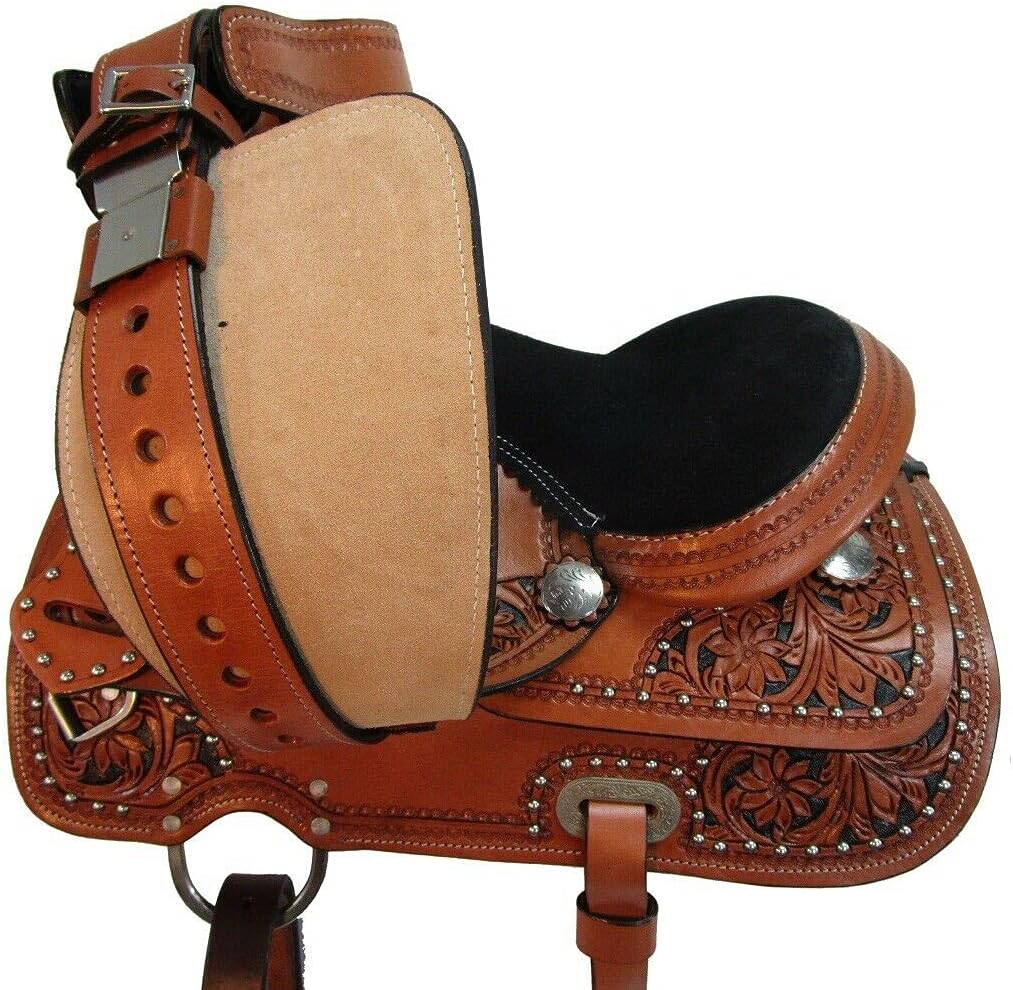 Experience the timeless beauty and craftsmanship of a genuine saddle. Meticulously handcrafted from premium leather, this saddle is designed to provide both rider and horse with exceptional comfort and support. The high-quality materials and attention to detail ensure durability, while the classic styling adds an elegant touch to any equestrian pursuit. Whether you're a seasoned rider or just starting out, this saddle promises a secure and enjoyable ride. With proper care and maintenance, it will become a cherished companion on your adventures for years to come. Elevate your riding experience with this exquisite saddle. *** Girth Cinch, Back Cinch, Saddle Pad, and Horse Bit NOT INCLUDED * Saddle Specifications:- Material: Leather. Colour: As Per Picture. Size: 8" inches Seat. Horn - 2" Weight - 6 lbs (approx.) Skirt - 14" x 15" Tree - 3 1/2" Gullet Stirrups Size - 3" Wide, 1 1/2" Thread Stirrups Range 15"- 22" Measurement is from center of seat to the bottom of the stirrup. It can also be adjusted to fit your child better by making additional holes.