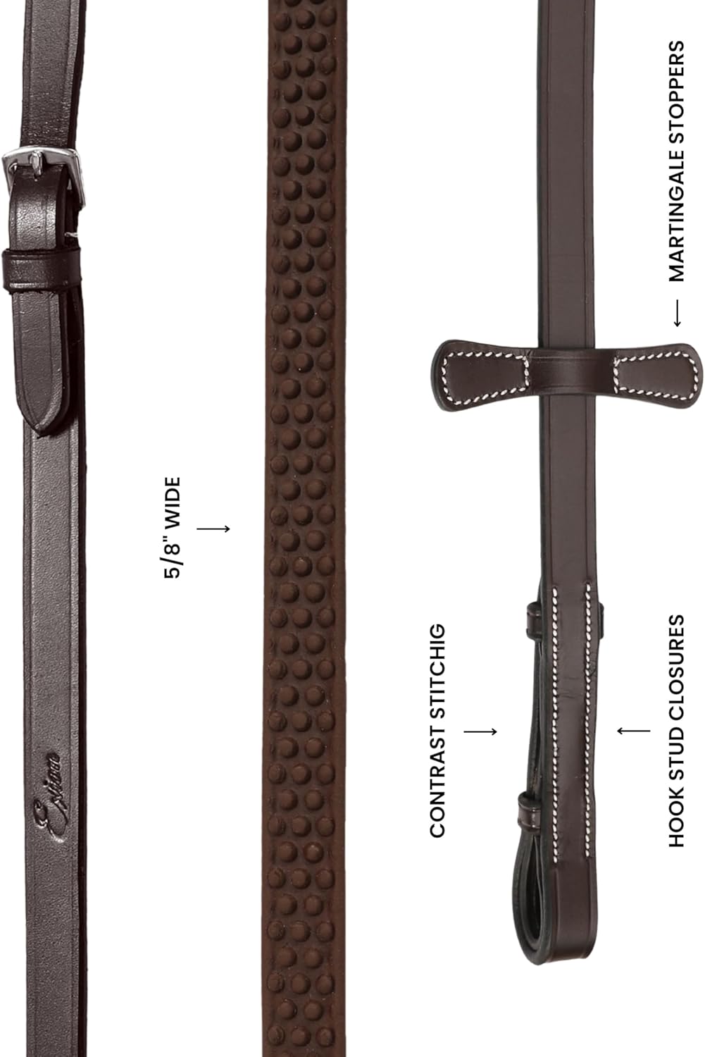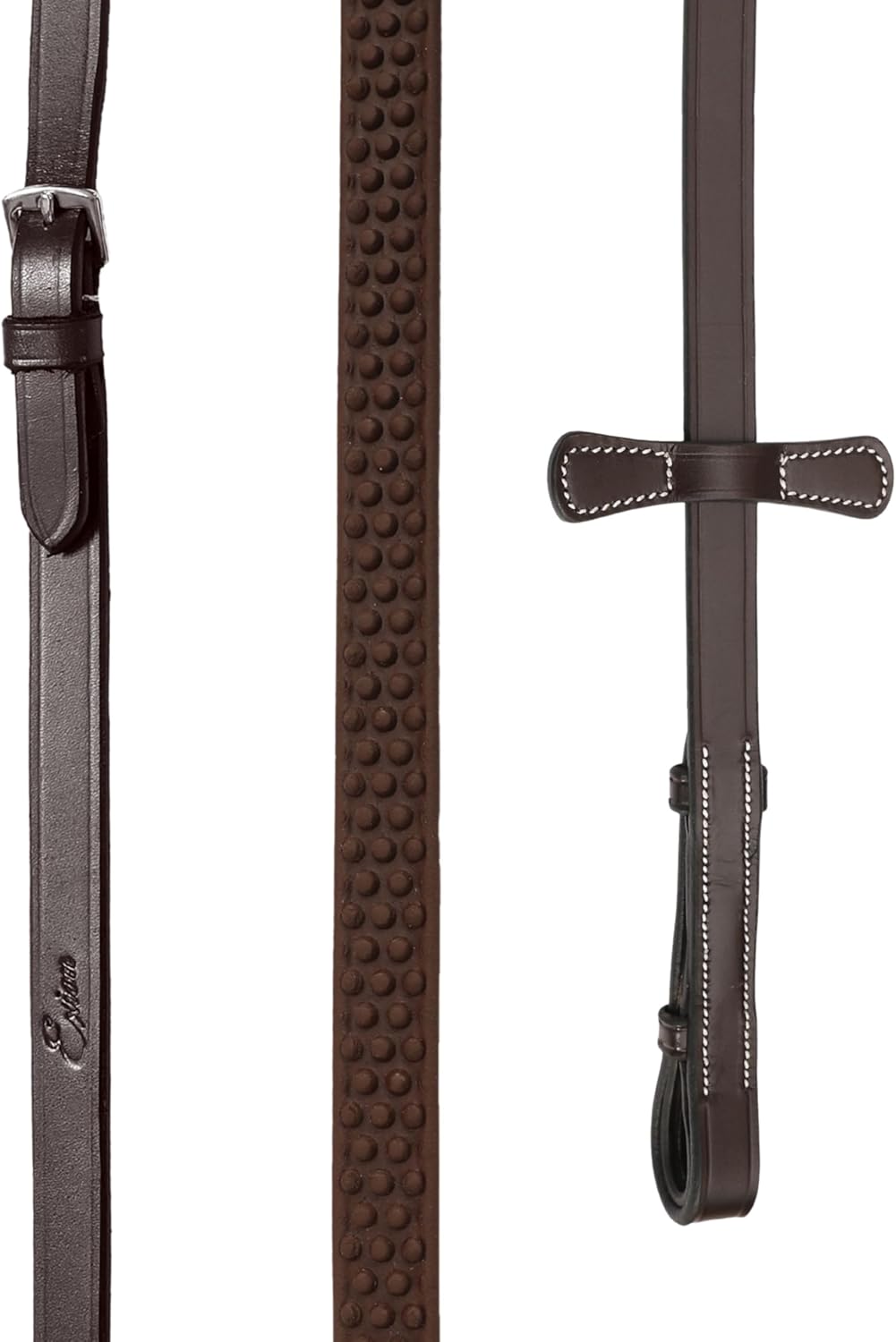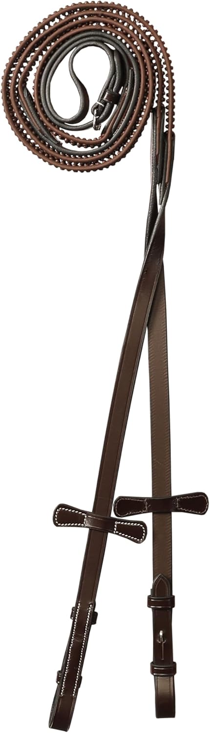 Ride with precision, comfort, and unmatched grip.The Exion Super Soft Bio Rubber Reins are engineered for riders who expect maximum performance from their tack. Featuring a unique combination of soft jelly feel and ultra-strong bio rubber, these reins offer a flexible, comfortable, and long-lasting riding experience. High-Grip Non-Slip Texture Designed for confident rein handling, even in rain or intense training. The secure rubber pattern ensures you maintain a solid connection with your horse. Premium Leather Craftsmanship Crafted with vegetable-tanned leather ends, these reins deliver durability, flexibility, and an elevated look suitable for competition and daily riding. Reinforced Stainless Steel Hardware Rust-resistant buckles provide long-term reliability and withstand the demands of schooling, eventing, and show environments. Martingale Stoppers Included Ride with stability and control—these stoppers keep your reins correctly positioned for safer performance. Ideal for All English Riding Disciplines Perfect for jumping, dressage, eventing, cross-training, or recreational riding. The 16mm (5/8") width sits comfortably in your hands, offering precise communication and reduced fatigue.Choose reins that perform as hard as you do—crafted for riders who demand superior grip, durability, and style.