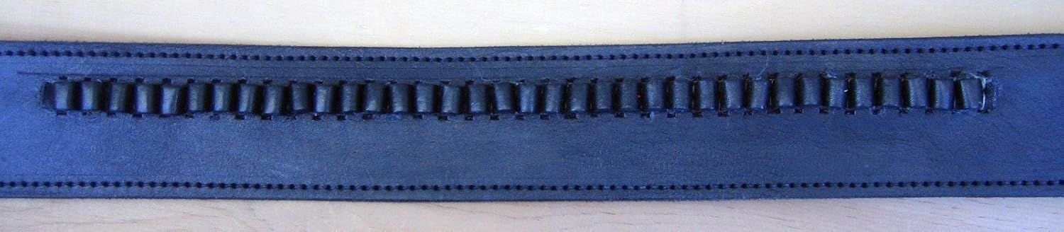 Black Cartridge Leather GUNS4US Belt In 22 cal ammo loops by . Brass belt ring. MADE IN USA Smaller and larger sizes also available upon special request! PLEASE EMAIL YOUR SIZE AFTER YOUR PURCHASE. Made of a single layer of 10 oz top grain saddle skirting with billet style closure. 36 sewn ammo loops for rim fire cartridges. Belt is 2 1/2 inches wide. Dimensions are actual measurements in inches. So, MEASURE YOUR ACTUAL WAIST SIZE to determine if this one fits. # **IMPORTANT NOTE ABOUT MEASUREMENTS** When measuring your waist for ordering this belt, PLEASE make sure that you measure over the pants and belt you may wear under the belt. Most people need a belt at least 5 inches bigger than what they wear in a pants size. stretch. PLEASE measure your waist again BEFORE ordering. And please measure exactly where you'll actually be wearing your belt.