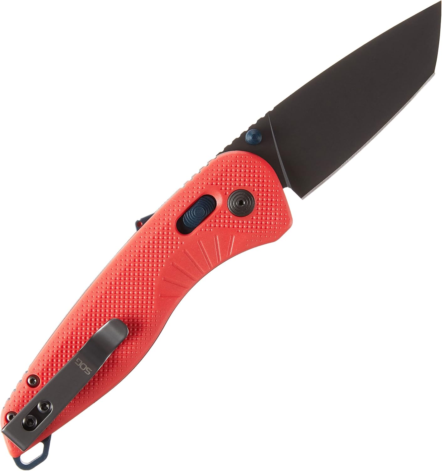 SOG AEGIS AT TANTO ASSISTED FOLDING KNIFE Designed for outdoor users, the Aegis AT Tanto assiste knife features rapid assisted opening with SOG's innovative ambidextrous AT-XR Lock with an ergonomic handle and grip pattern for comfortable use. The Aegis AT Ambidextrous hunting knife is easy to carry, with a highly functional 3.11" cryogenically heat-treated D2 tool steel blade.Ambidextrous design that features fast deployment, even when wearing gloves. Its powerful XR locking mechanism also features solid built-in blade locking safety and a spine-mounted safety system. The tanto blade is optimized for tasks that include penetrating cuts through harder material and precise slicing. The next evolution of the legendary Aegis. CONSIDERED DESIGN Smooth, yet textured for optimal grip, the handle is designed for comfort and confidence in outdoor conditions. Including a prominent lanyard loop that also acts as a hand-stop to mitigate slippage. MULTIPURPOSE COMPACT HUNTING KNIFE Whether you are hiking, camping, or hunting, you need a knife that can handle the unexpected. With help from the adventurers and explorers out there, SOG made the Aegis the perfect outdoor companion. When going into the uncharted, every piece of gear needs to be precise and dependable. Purposefully designed for working outdoors, Aegis AT feels great in hand and great to use. Smooth, yet textured for optimal grip, the handle is designed for comfort and confidence in outdoor conditions. Including a prominent lanyard loop that also acts as a hand-stop to mitigate slippage.