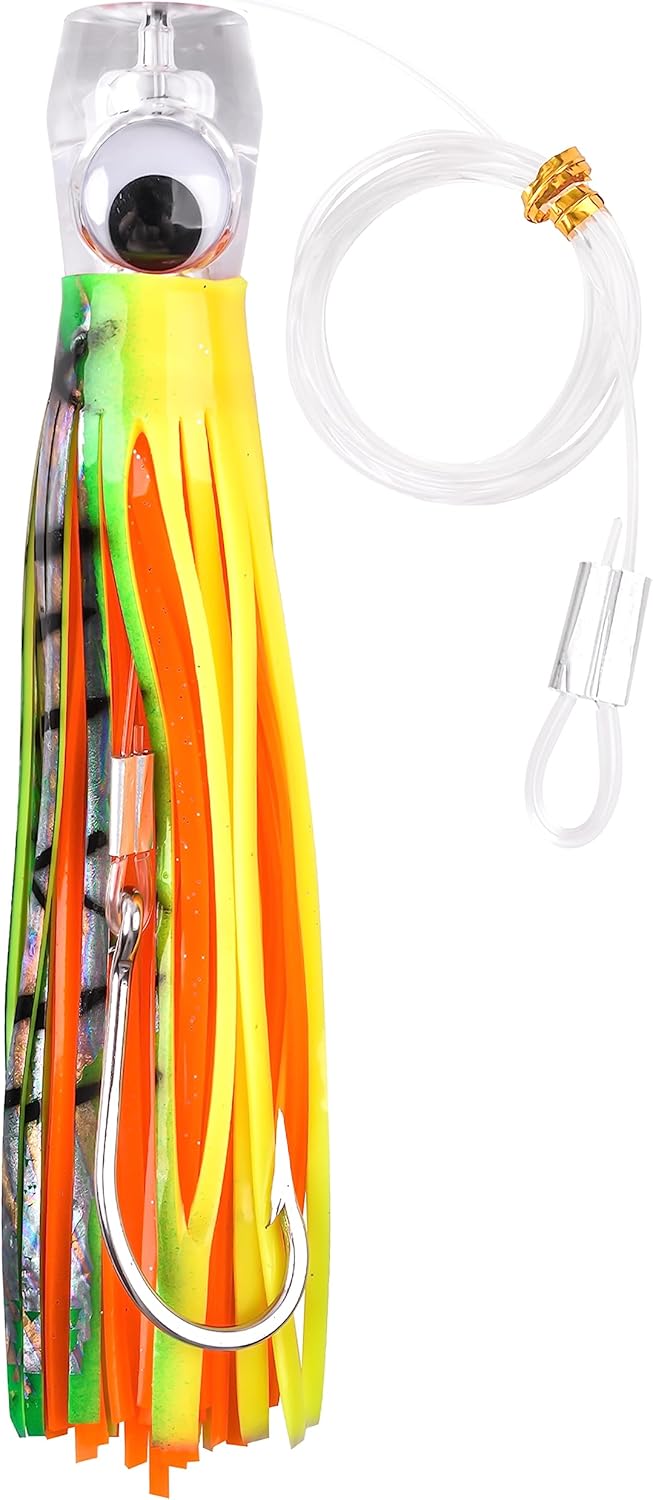 OROOTL Fishing Trolling Lures Saltwater Fishing Lures Deep Sea Fishing Lures for Marlin Tuna Mahi Dolphin Wahoo Shark Big Game Ocean Fishing Lures SetSpecifications:Quantity: 1pcs/5pcsLure Length: 6inch/9inchHook Size: 6/0(6in), 8/0(9in)Mono Line: 150LBColors: Orange, Yellow, Blue-White, Purple-Black, Orange-YellowAcrylic head with soft skirts trolling lure. Lifelike big eye make a real fish design. Colorful skirts make active swimming actions in water.Great saltwater fishing lures kit for Marlin, Tuna, Wahoo, Bull Dolphin, Billfish and so on.