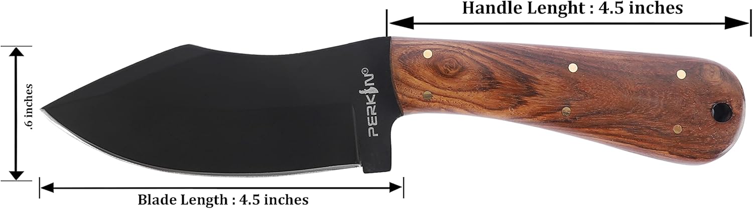 "Overall length:9.0 inches, Blade's length:4.5 inches Blade's thinckness:3.5mm Blade's material:1080 steel Handle material:Rose wood, Hardness:59-60