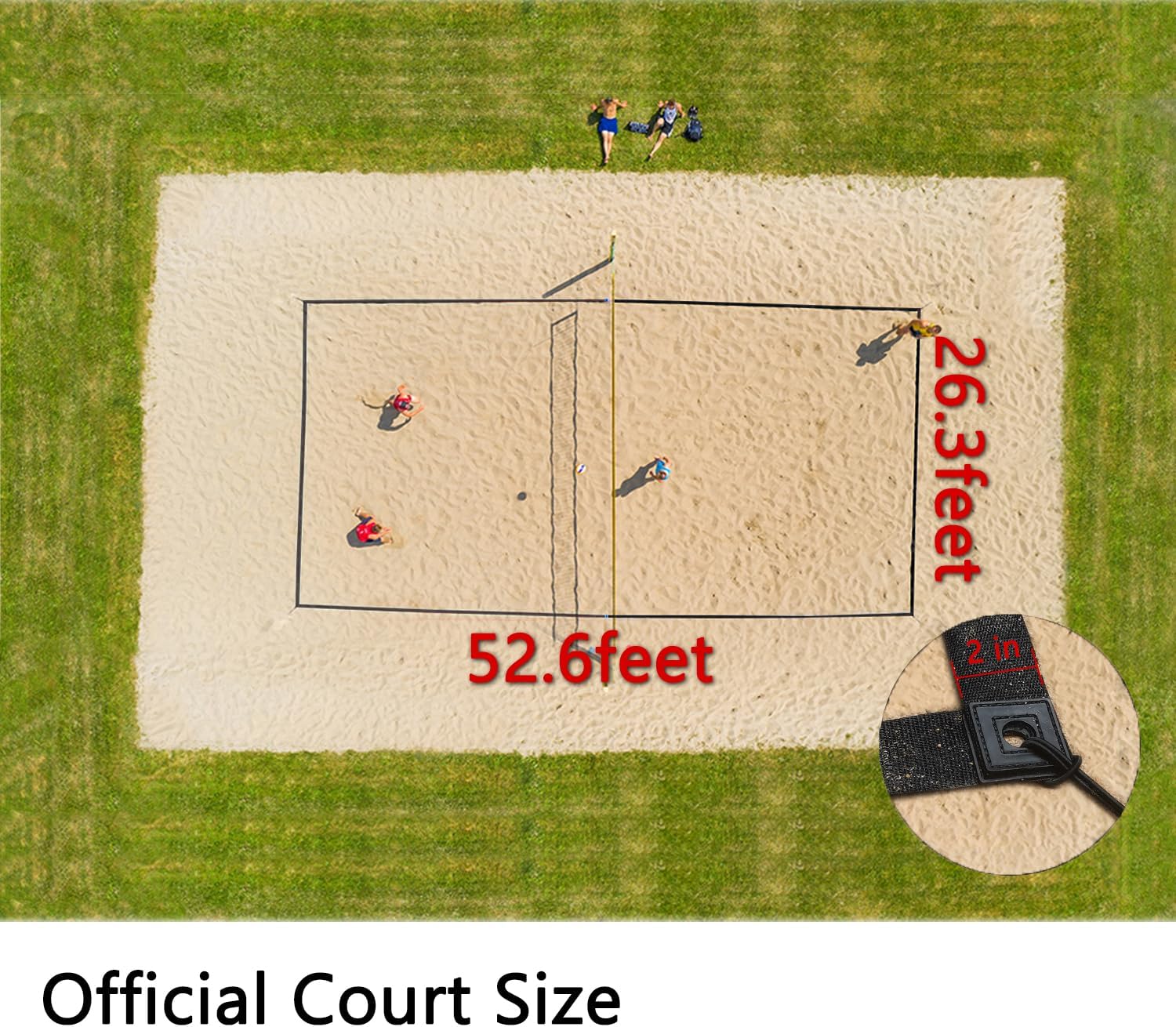 OMSORG Volleyball Court Line, easy to set up, save your time and you could just relaxed during the volleyball game! Upgraded Features: 4 U-row Piles for better fixation or used into grass. Clear visible center marks, easy to set up. Bigger and better Sand plates. Compact carrying bag for storage. Instruction Steps: 1: Unroll the lines and align the 4 corners 2: Pass the bungee cord through the corner 3: Using the center court markings 4: Bury the square plate / plug the mental pile Size: official FIVB and AVP Volleyball court dimensions, 26.3' x 52.6' and 2" wide Occasions: Beach volleyball boundary for beach and grass. The U-row piles are for the grass or your backyard. The Sand plates are for the beach volleyball especially for the beach. Package: Long lines x2 (2 inch wide, 52.6 ft long); Short lines x2 (2 inch wide, 26.3 ft long); Square sand plates with elastic bands x4; row metal pile x4; Carrying bag