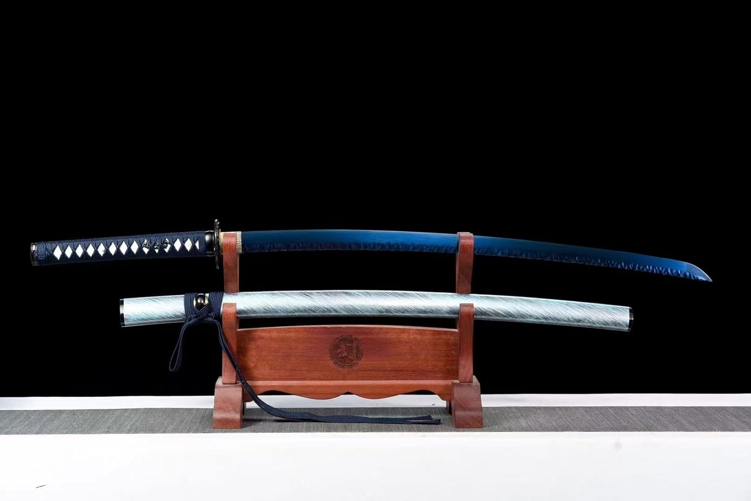 Handmade Forged, Stone, Roasted Blue, Samurai Total Length: 40.6 inches (103 cm) Blade Length: 28 inches (26 cm) Blade Thickness: 0.7 cm Blade Width: 1.25 kg Weight: Approx. High-carbon steel, Retains Original Forged Stone Pattern, Roasting Blue Process Treatment, Hammered , Bent 90 degrees Fast Back Straight High Hardness Up to 6 degrees maximum maximum 6 degree 0 degrees, zinc alloy set, sheath material: solid wood, large varnish sheath, handle: hand wrapped rope