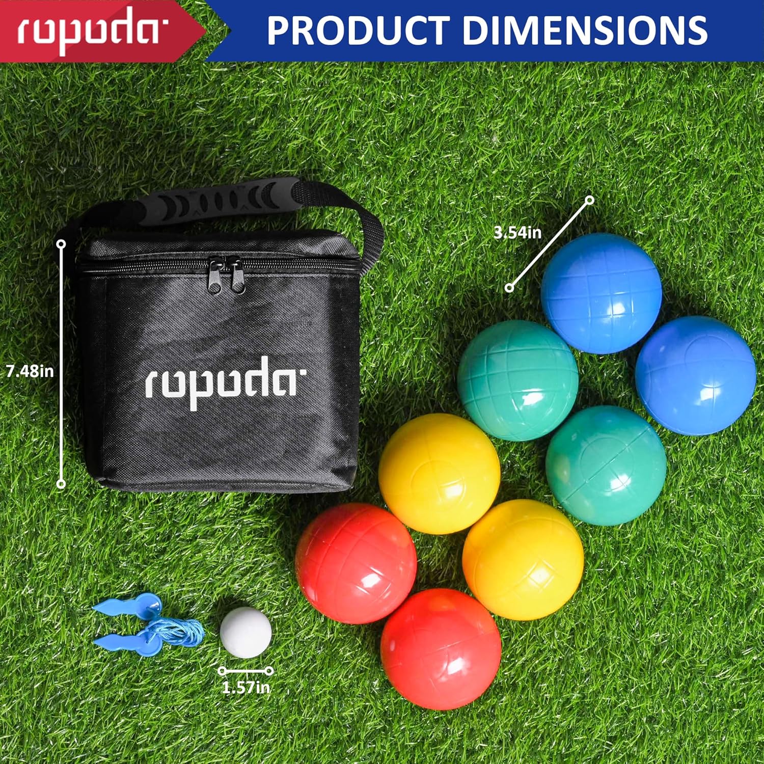 | Included Components | 8 x 90mm composite plastic bocce balls (2 red, 2 blue, 2 green, 2 yellow), 1 while pallino, 1 measuring rope, 1 carrying bag |