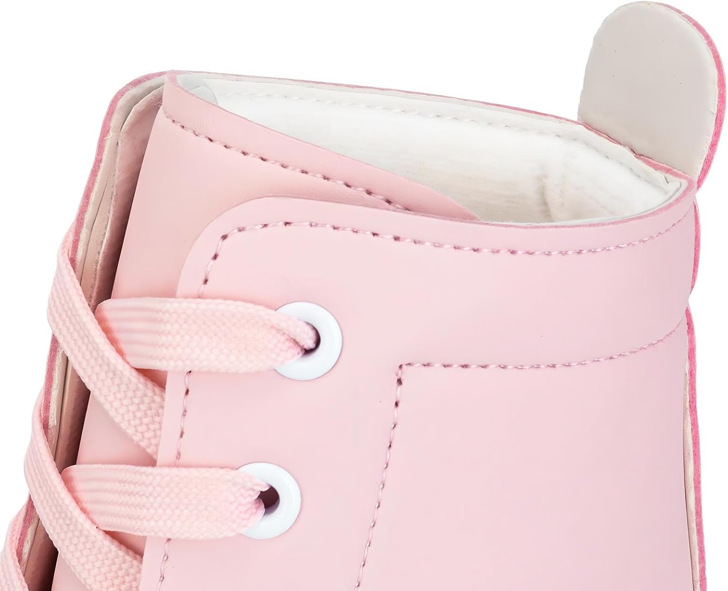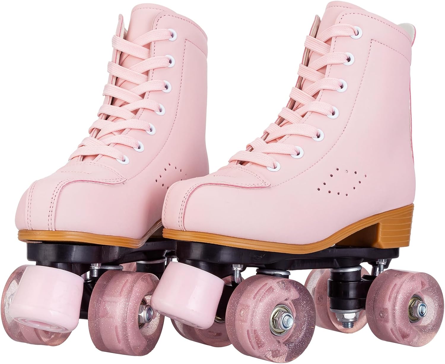 Welcome to our store Our aim is to provide the best products and services for you to make your life more comfortable and convenience. Specification Material : PU Leather Type: Classic Double-row Roller Skates Color: Pink/ Purple Wheels: High Quality Crystal Pink/ Crystal Purple PU Wheels (Flash Wheels) Bearing: ABEC-7 Bearing Closure Type: Drawstring Weight: About 3000 gram Size Chart Our Size --- Heel To Toe(mm) --- Heel To Toe(inch)--- US SIZE(WOMEN) --- YOUTH SIZE 32 --- 210mm --- 8.26inch --- Youth Size 1 33 --- 216mm --- 8.50inch --- Youth Size 2 34 --- 222mm --- 8.74inch --- Youth Size 3 35 --- 228mm --- 8.97inch --- US Women 5 --- Youth Size 4 36 --- 234mm --- 9.21inch --- US Women 6 --- Youth Size 5 37 --- 240mm --- 9.45inch --- US Women 7 --- Youth Size 6 38 --- 250mm --- 9.84inch --- US Women 8 39 --- 255mm ---10.03inch --- US Women 8.5 40 --- 260mm ---10.23inch --- US Women 9 41 --- 270mm ---10.62inch --- US Women 10 Packing: 1 Pairs x Roller Skates + 2 x ABEC-7 Bearing+ 1 x Small Tool Attention 1. Chromatic aberration existed due to different display setting. 2. There may be 1-3mm differences as manual measurement. 3. Please keep the small tools in the package, the small tools can adjust the tightness of the wheels. If you encounter a wheel that does not flicker, please don’t worry, just use a small tool to loosen the wheel a little, and the wheel can be used normally.