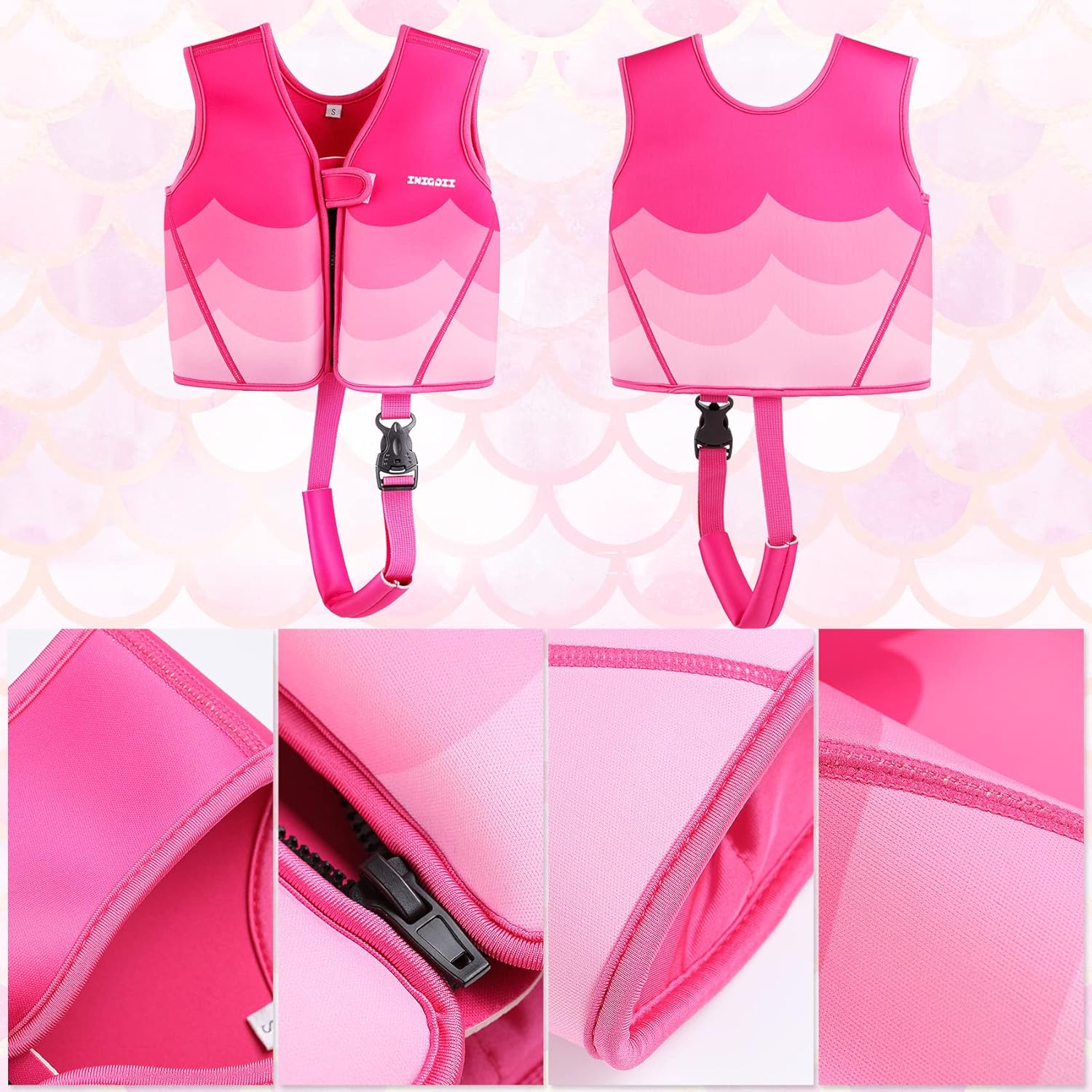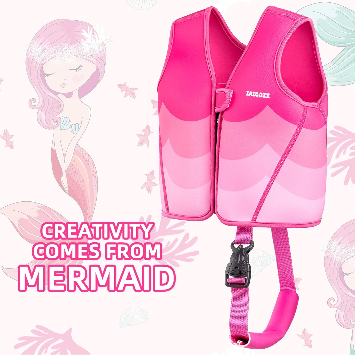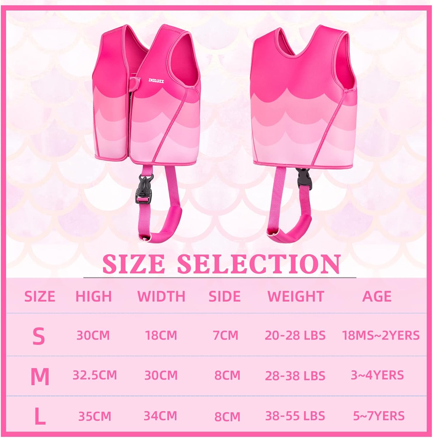 Do you want your child to learn to swim happily? INIGGII swim vests are the ideal helper for safe swimming and swimming lessons for your children thanks to ensuring perfect stability. Helps children learn to swim. Develops swimming abilities while also building confidence in young swimmers. Adjustable anti-rise safety strap between the legs for a perfect fit. The swim vest has 8 removable EPE pearl foams and is the ideal starter swim jacket, with 1 per pocket to give a better fit and more adjustable buoyancy. Sometimes the pearl foam components are removable so as their swimming skills improve, fewer pearl foams are needed. Product Details Suitable for ages: 18 moth-2 years Maximum weight capacity: 20-28 lbs Material: Neoprene, Nylembu, Lycra, Removable soft EPE pearl foam positioned inside pockets Design Style: Mermaid,Shark Features Encourages user to develop a natural swimming position Promotes water confidence Level 1 water confidence Easy fit design Additional Information Package Includes: 1 x Kids Swim Vest 1 x Drawstring bag 1 x Manual