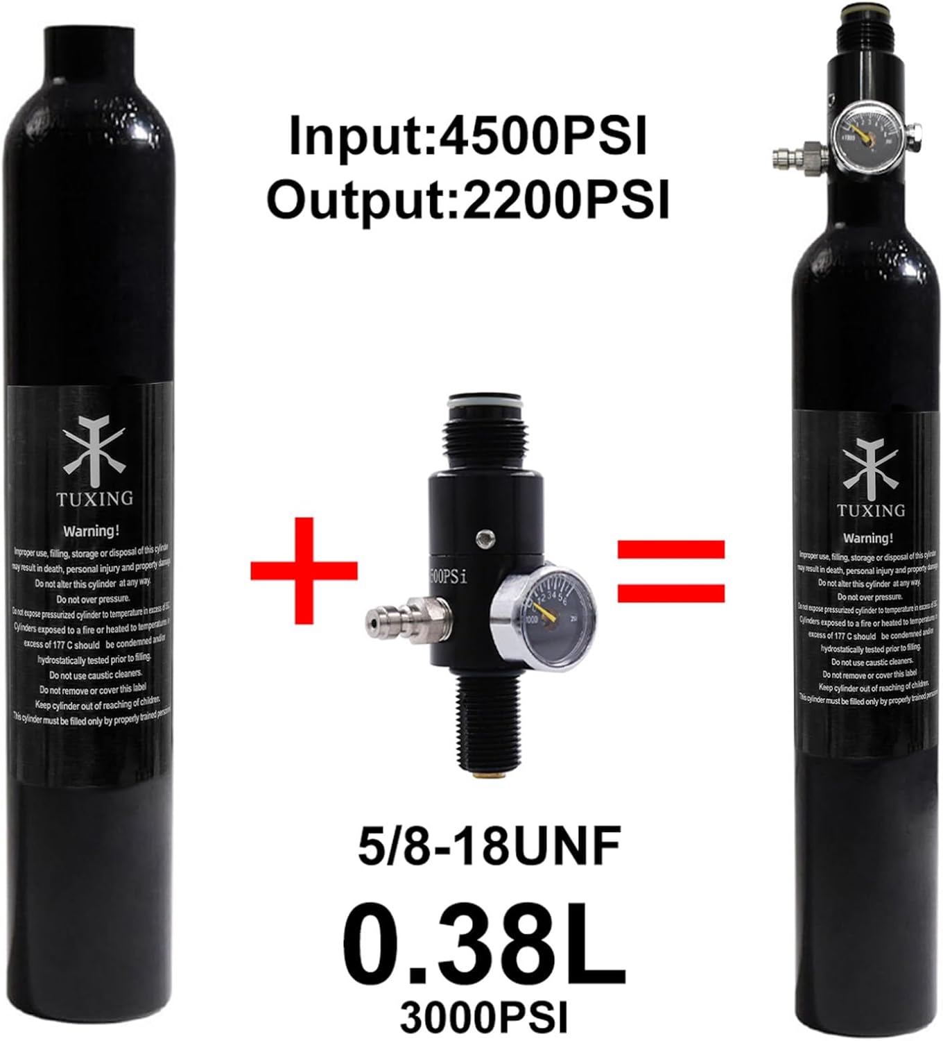 Product Application: Loading gas, Emergency escape, Fire breathing, Underwater breathing, Lifesaving of ships, Clean energy, Snorkeling diving breathing, PCP rifle and Paintball filling, Medical care and Mine emergency etc. Widely for fire-fighting, chemical industry, shipping, laboratory, mine, pertroleum, warehouse, factory and metallurgy, it can be used in various positive pressure breathing apparatus.Product Capacity: 0.38 liters / 23cubic inch capacity, Product Neck Thread: 5/8-18NUF thread. Input Pressure:4500psi Output Pressure: 2200psi;Standard Pressure: 3000Psi/200Bar.Product Certification: CE Certificate , Not DOT approved.Product Material: aluminum