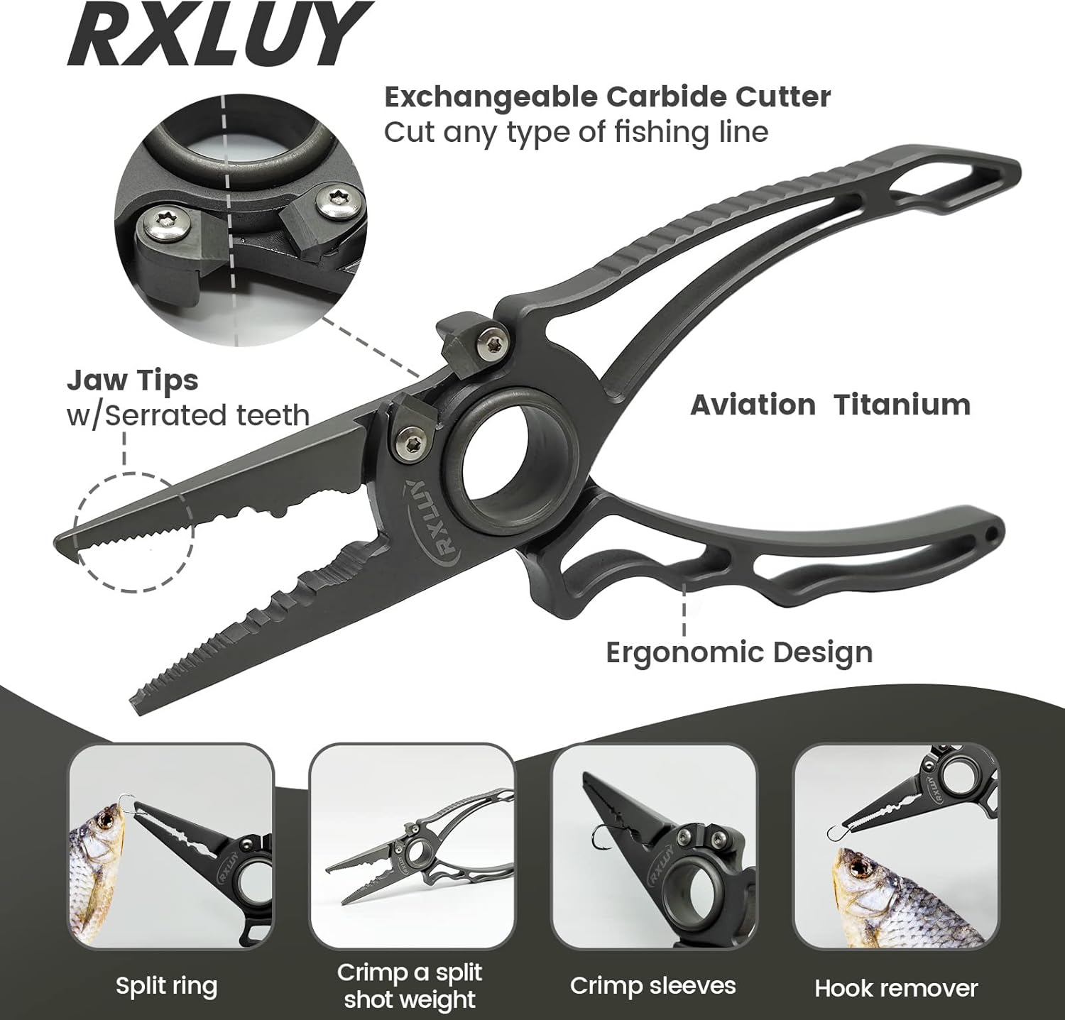 Unleash the power of precision with the RXLUY Titanium Fishing Pliers, Your ultimate companion on every fishing adventure. Crafted from aviation-grade titanium, these pliers are as tough as they come. Weighing just 0.31lb, they combine incredible strength with an ultra-light design, making them perfect for all your outdoor pursuits. Whether you're fishing the pristine waters of a lake, battling the saltwater tide, or braving the chill of extreme conditions, these pliers will never rust, ensuring long-lasting performance you can trust. Designed with the angler in mind, these 7.42" pliers feature a hollow handle and a convenient center slot for hanging your essential fishing tools. Imagine a tool so perfectly shaped that it naturally molds to the curve of your hand, the contoured design fits four fingers comfortably, while the thumb-side non-slip texture offers the stability and control you need to take on any task. With each use, you’ll feel the balance and precision, making it the perfect tool for those who demand more from their gear. The RXLUY pliers aren’t just about looks. They’re about function, too. Equipped with non-slip teeth and a hooked tip, they’re designed to give you a firm grip on even the trickiest hooks. With integrated crimping grooves and a razor-sharp tungsten cutter, you’ll slice through mono, fluorocarbon, and braided lines effortlessly, ensuring that your rigs are ready when you are. Never struggle to find your tools again. Whether you're casting off from a boat or waiting on the shore, the included belt-clip holster, lanyard, and carabiner keep your pliers within arm’s reach. No more digging through your tackle box, just grab, use, and get back to the action, knowing your tools are securely stored and ready for anything. Looking for the perfect gift for the angler in your life? The RXLUY Take your fishing to the next level with the RXLUY Titanium Fishing Pliers. Performance, precision, and reliability—All in one