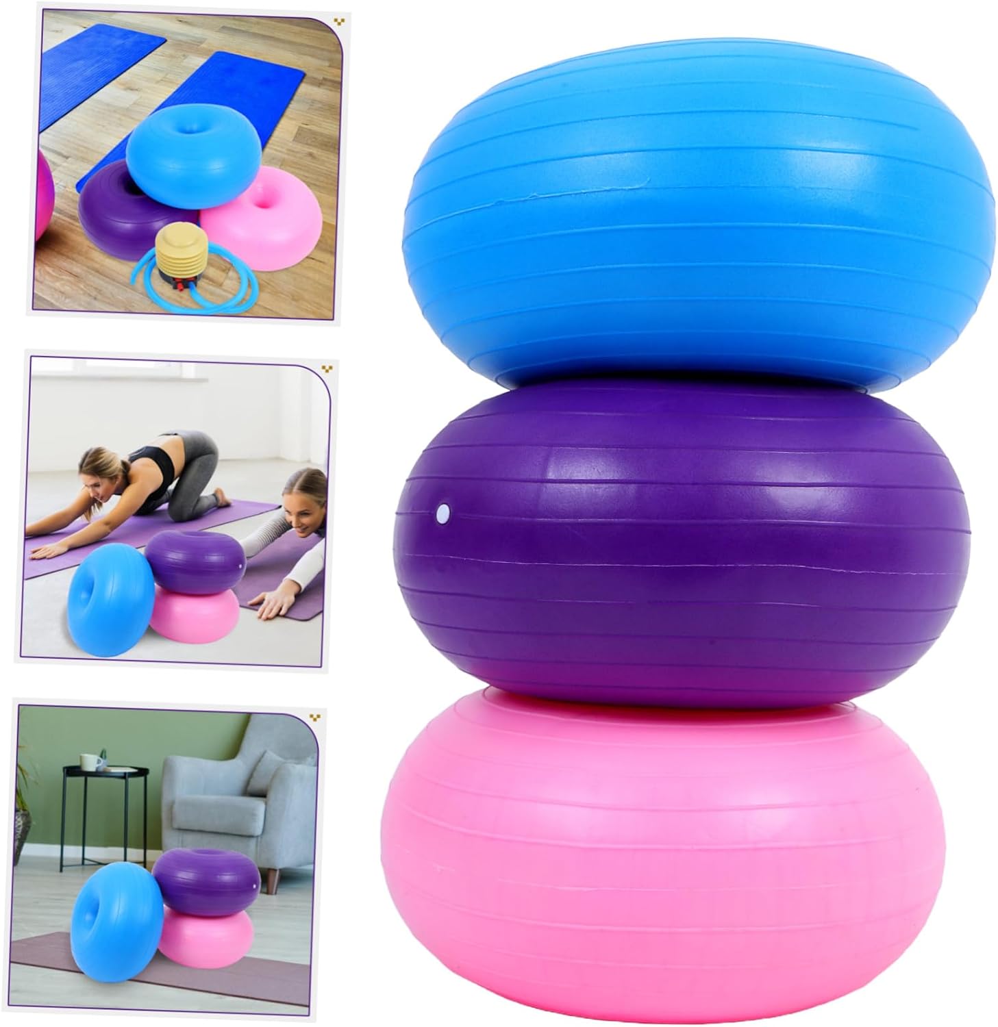Package Include 3 x Donut Yoga Ball Chair 1 x Hand Pump Features -Effortless inflation: easily inflatable, this ball is convenient to set up and store, making it suitable for use , school, or on the shape yoga ball -Fun and attractive: shape and vibrant design make it appealing to , motivating them to engage in physical activities and stay exercise equipment -Balance and coordination: helps and students enhance their balance and coordination, supporting their physical development and yoga balls for classroom - one exercise ball: ideal for , yoga, and fitness training, this inflatable donut ball offers a comprehensive solution for various physical activities inflatable seating chair -Size:120.00X9.50X6.50cm/47.16X3.73X2.55in inflatable donut ball -Color:Assorted Color stability exercise ball -Size:44.00X44.00X28.00cm/17.29X17.29X11.00in exercise ball chair -Fine construction: crafted from soft materials, this ball ensures comfort and durability, providing and enjoyable workout experience stability training ball -Material:PVC yoga accessoriesGoods Descriptionbalance exercise ball Its donut shape provides a , helping to coordination and flexibility.balance workout ball Enhance and yoga sessions with this inflatable stability ball.exercise ball chair The ball's non-slip surface ensures safety during workouts, while its compact size makes it suitable for various environments, from classrooms to living rooms