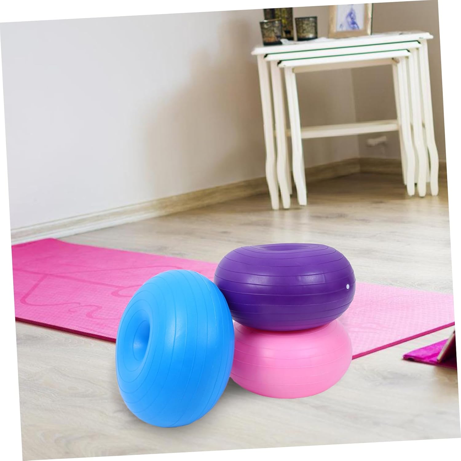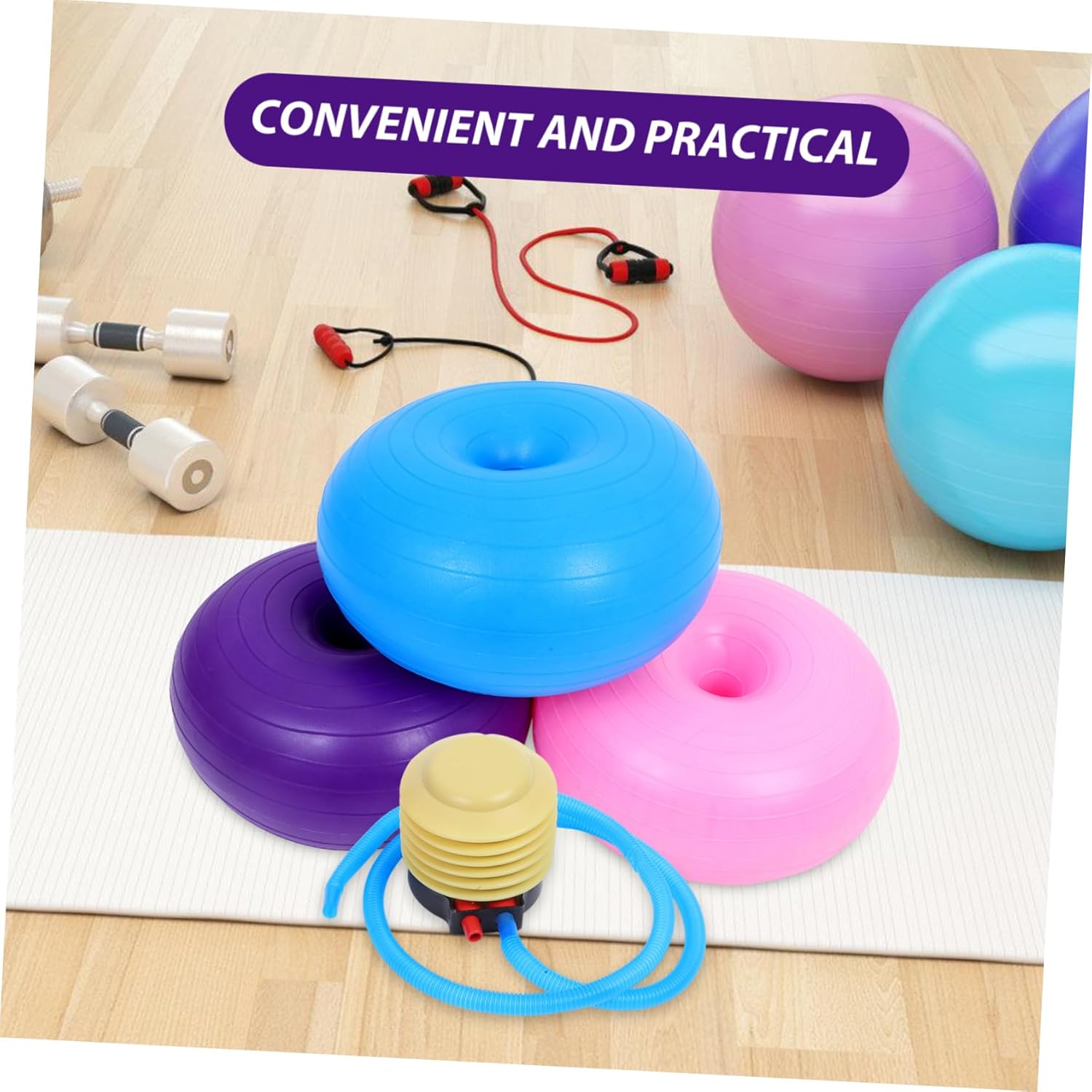Package Include 3 x Donut Yoga Ball Chair 1 x Hand Pump Features -Develops balance skills: designed to balance and coordination, this ball is a great tool for and students to enhance these crucial abilities pilates equipment -Color:Assorted Color yoga balls for exercise -Comprehensive fitness tool: suitable for pilates, yoga, and general fitness exercises, this inflatable donut ball supports a wide range of physical activities yoga ball -Material:PVC inflatable exercise ball -Size:120.00X9.50X6.50cm/47.16X3.73X2.55in yoga balls for classroom -Portable and easy to inflate: inflates and deflates with ease, making it simple to transport and store, ideal for fitness on the go exercise stability ball -Kidfriendly appearance: the fun donut shape and bright colors attract attention, encouraging them to participate in physical activities exercise ball chair -Soft and durable: made from soft materials, this ball offers a comfortable and exercise experience, resistant to wear and tear balance training yoga ball -Size:44.00X44.00X28.00cm/17.29X17.29X11.00in inflatable pilates ballGoods Informationexercise ball chair 's lightweight construction allows for easy transport, making it a versatile addition to any .exercise stability ball The inflatable exercise ball is a multifunctional fitness tool that supports a wide range of activities, from Pilates to general workouts.yoga ball chair Its design helps to engage multiple muscle groups, overall body strength and stability