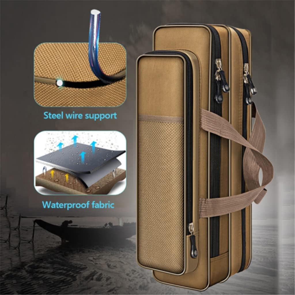 zipper design, convenient to store different fishing tools, easy to useLarge capacity and spacious fishing rod holder can accommodate fishing rods, fishing lines, pontoons and other fishing tackleFishing bag made of 1200D canvas, waterproof and .The design of the hand strap makes the fishing suitcase easy to carryThe for fishing enthusiasts, the fishing rod box will well your fishing gear.Specification: Color: KhakiMaterial: 1200D waterproof Oxford clothOccasion: Outdoor tourism,mountain climbing,cycling,trekking,fishing.Package Include: 1*Fishing bagIf you have any questions about the product, please me, we will you within 24 hours and give you a satisfactory answer.Made of nylon material, waterproof and wear-resistant,Can protect your fishing rod well.