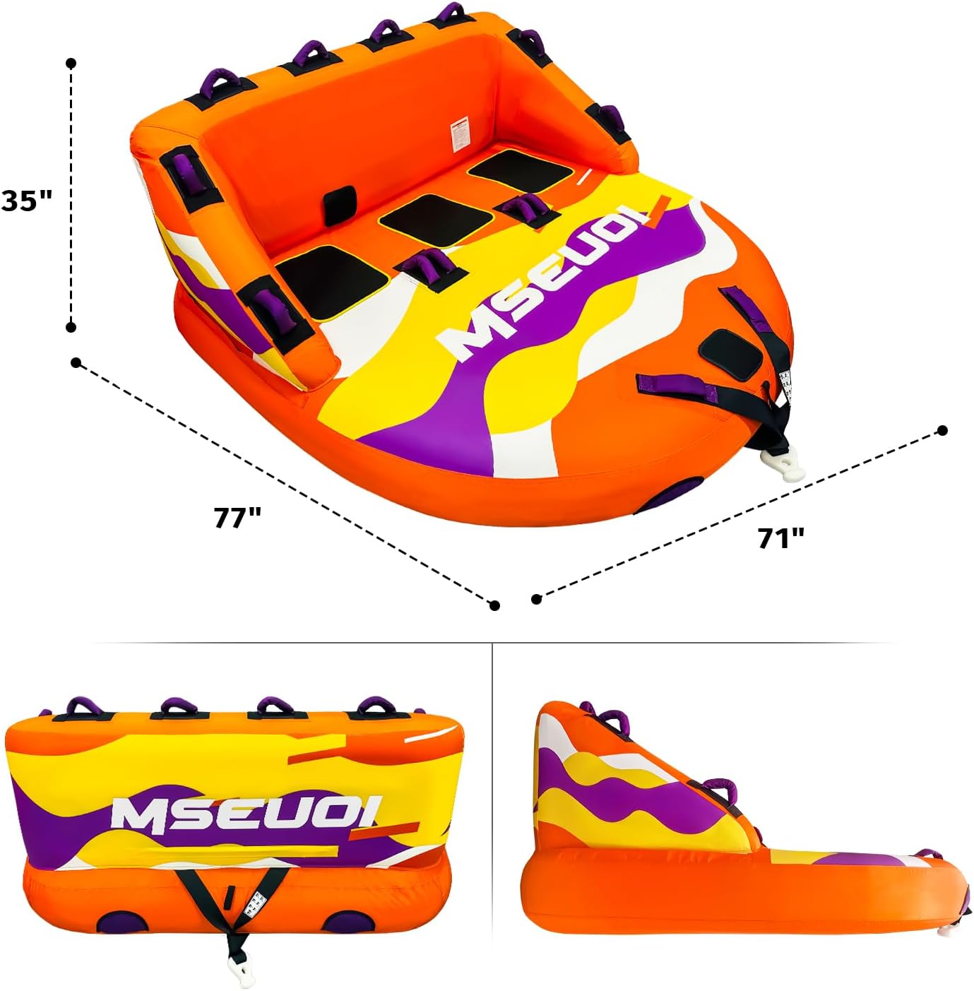**Make Waves with the Ultimate Towable Tube!** Whether you're skimming across calm lakes or carving through ocean swells, our **Premium Water Towable Tube** delivers heart-pumping fun for families and thrill-seekers. Built to withstand extreme speeds and sharp turns, its innovative hull design keeps riders stable while creating epic splashes. **Technical Specs**: - **Dimensions**: 77" (L) x71" (W) x 35" (H) inflated - **Weight Capacity**: 800 lbs (max) / 250 lbs per rider - **Material**: 800D PVC + nylon mesh underside - **Included**: Tow tube, repair kit, - **Colors**: NeonPurple w/Electric Blue **Safety Notice**: Always wear a USCG-approved life jacket. Not recommended for children under 12. Avoid shallow water and obstacles. Follow boat speed guidelines.
