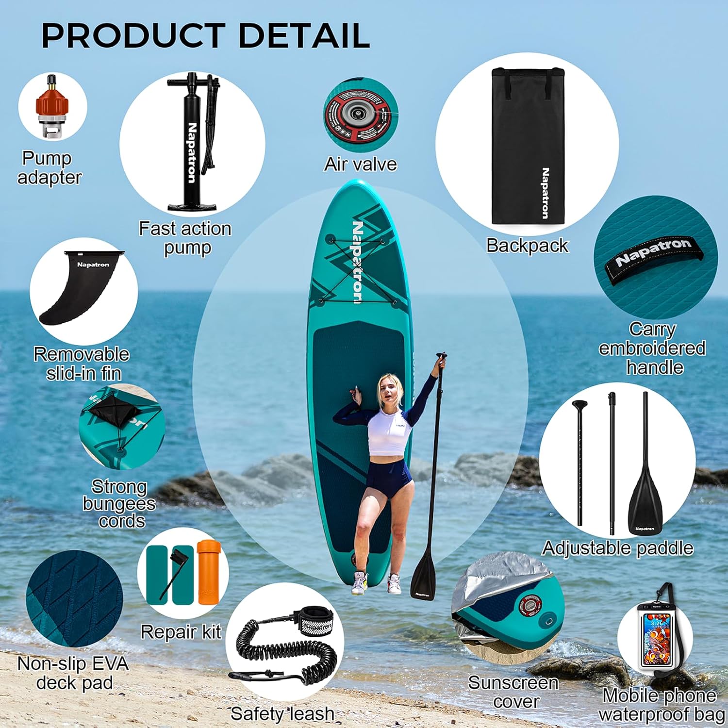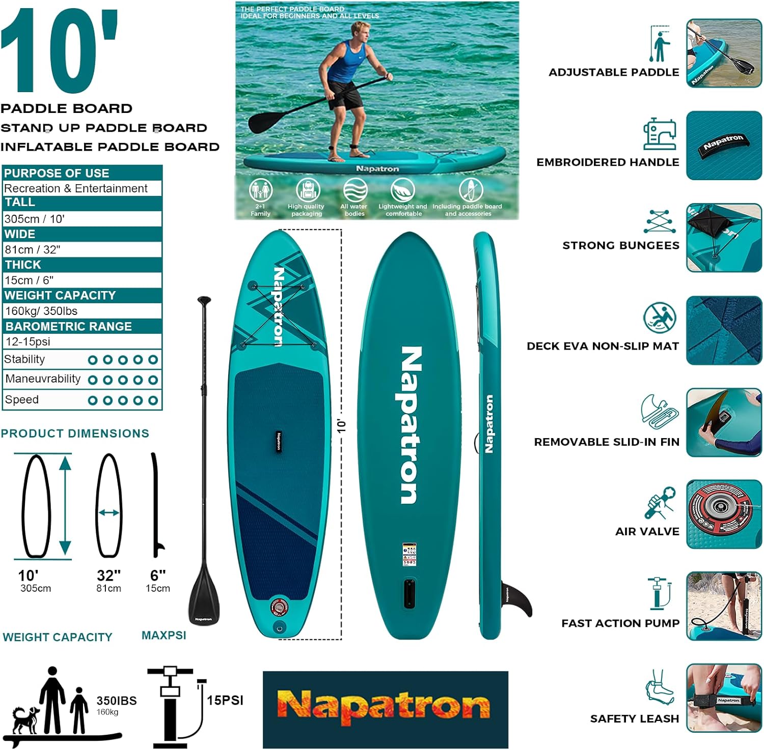 This complete inflatable stand up paddle board kit from Napatron is perfect for enjoying time on the water. The 10-foot ultra-light board features an extra-wide 32-inch design for stability, whether you're just starting out or an experienced paddler. The durable PVC construction inflates and deflates easily for portability. A high-quality adjustable paddle with comfortable T-grip allows you to power through the water with ease. Other accessories include a Travel BackPack, waterproof phone bag and Ankle Safety Leash, as well as a Sunscreen Cover to protect the board from UV rays when not in use. With its reasonable price and everything needed right out of the box, this kit makes stand up paddling accessible for families, friends, or anyone looking for a full-body water sport