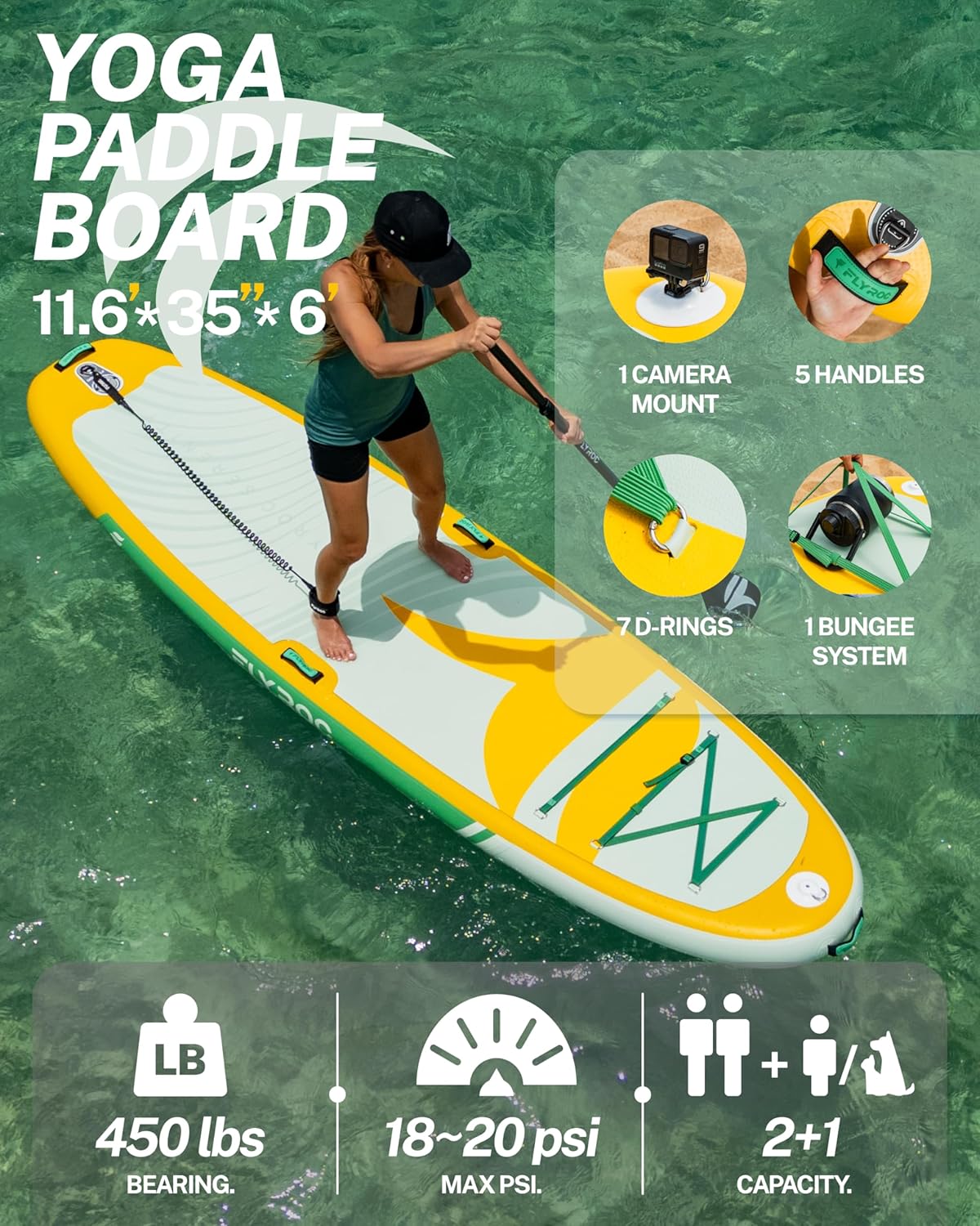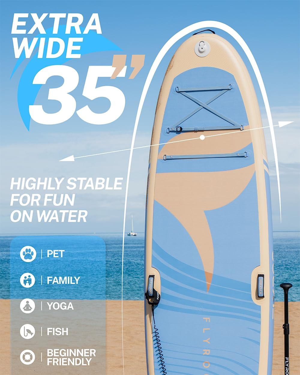 Premium 100% FULL EVA non-slip deck pad provides ultimate grip and comfort, great for All Skill Levels: yoga, fishing, vlogging, drifting, floating. Extra stable of 35" in width ensure supper steady performance and stable touch, ideal for all range of people, especially care for beginners, ladies, teenagers, elderly in company.