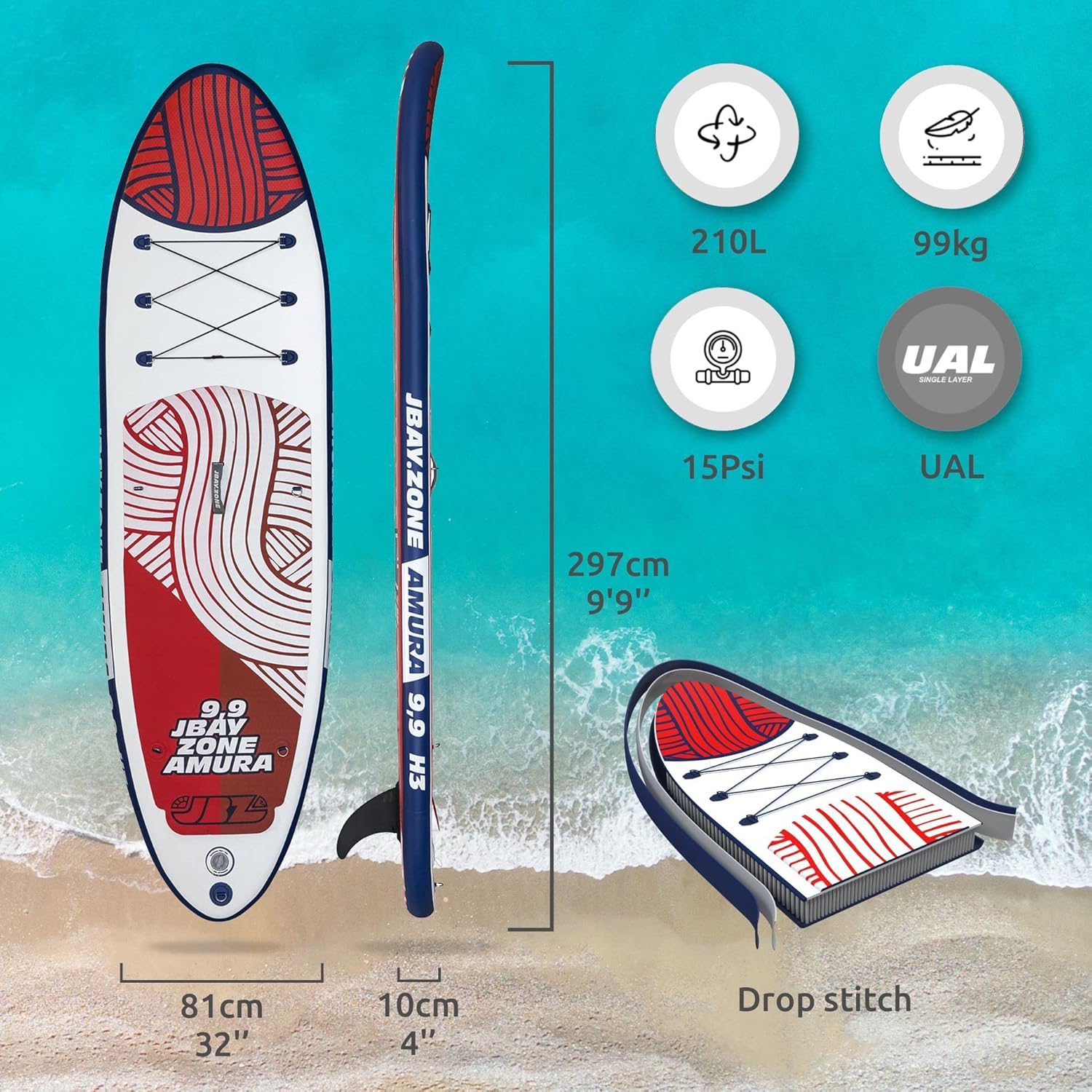 Amura h3 is the entry level sup of jbay.zone designed and made specifically for those who are approaching the world of paddle boarding. The deck has been enlarged and measures 32 inches wide, wider and more stable than a "standard" paddleboard for ease of control. With a thickness of 10 cm, this sup is ideal for paddlers with a medium light build and is a very versatile board, perfect for medium duration trips in calm or low choppy waters. Entirely in laminated PVC, to make the amura h3 sup is used the drop-stitch technology ual, which allows the sup, once inflated to the ideal pressure of 15psi, to achieve exceptional rigidity with a Great support support the weight.. The EVA foam deck cover provides extra support and increases the stability of the sup during use. Another strong point of this board is the rail reinforced by an extra layer of laminated PVC for greater safety and resistance to any bumps or stresses. JBAYZONE uses for its stand up paddles only high pressure valves, with bayonet coupling, to inflate the board without the risk of suffering pressure losses and facilitate the emptying of the inner chamber, which takes place independently once the valve is unlocked. This is a The supplied fin is single, removable and made of PVC. The steel d-rings installed on the deck allow the use of various accessories such as the practical seat for the transformation of the sup into a kayak or the safety anklet. the amura h3 sup includes a complete equipment of high quality accessories: - bravo pump equipped with a mode selector to switch from double action to single action; - paddle with extendable aluminium handle, to adapt perfectly to the height of its user with a palpala incincincincPVC; - Carry bag to comfortably carry sup and accessories, spacious and compact can be worn as a backpack; - Safety leash with adjustable Velcro closure and spiral cable extendable up to 300 cm; - GoPro Hero support to mount the action camera directly on the deck and record exciting excursions in sup.