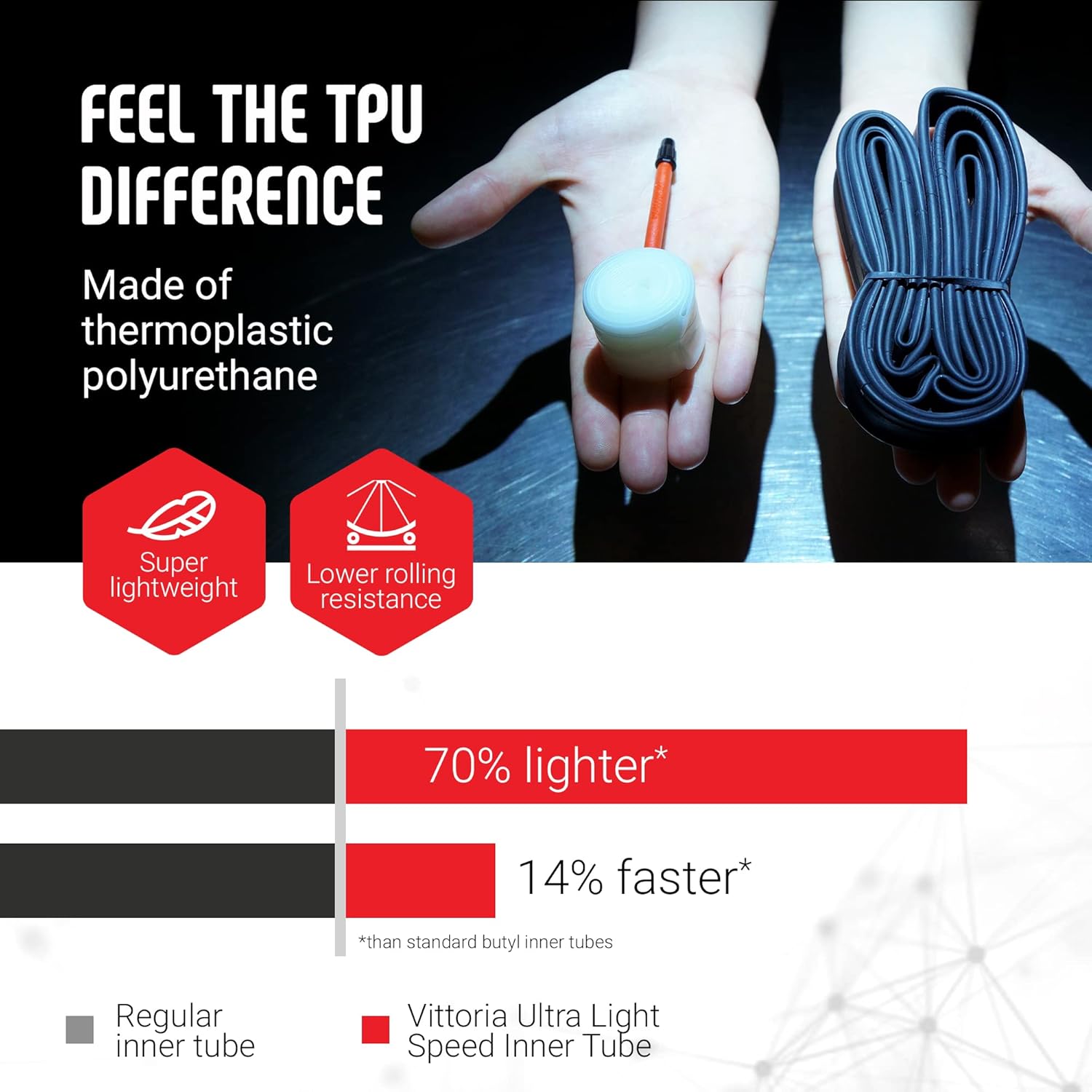 Vittoria Ultra Light Speed TPU Bike Inner TubeThe fastest and lightest. Made for pure speed.Vittoria Ultra Light Speed inner tubes are made for pure speed. Designed to offer the lowest rolling resistance possible, Ultra Light Speed are the fastest and lightest tubes ever developed by Vittoria. They are 70% lighter and 14% faster than standard butyl tubes.Ultra Light Speed inner tube 700x25c / 30c with FV Presta RVC Valve 60mmMade of thermoplastic polyurethane (TPU), which offers lower rolling resistance and are lightweight compared to standard butyl inner tubes. By using Ultra Light Speed tubes in both tires, you can save up to 160 g. That’s why Ultra Light Speed are the perfect choice for road cyclists that want the highest speed without giving up the practicality and ease of use of a tube tire set-up.IMPORTANT!Given their lightness, Ultra Light Speed bike inner tubes require extra care during the mounting process. The plastic material they are made of is subject to heat shock. In fact, they are compatible with disc brake wheels only, as the heat generated by brake pads at the rim level can deteriorate the inner tubes.The Ultra Light Speed bike tubes feature a red, Vittoria-branded, extensible valve with removable core. The packaging also contains a repair patch and a cleaning cloth.Ultra LightEasy to InstallCompatible with disc brakes onlyTPU material is 100% recyclable*Made in Germany*Valve must be cut off from the tube before disposal.