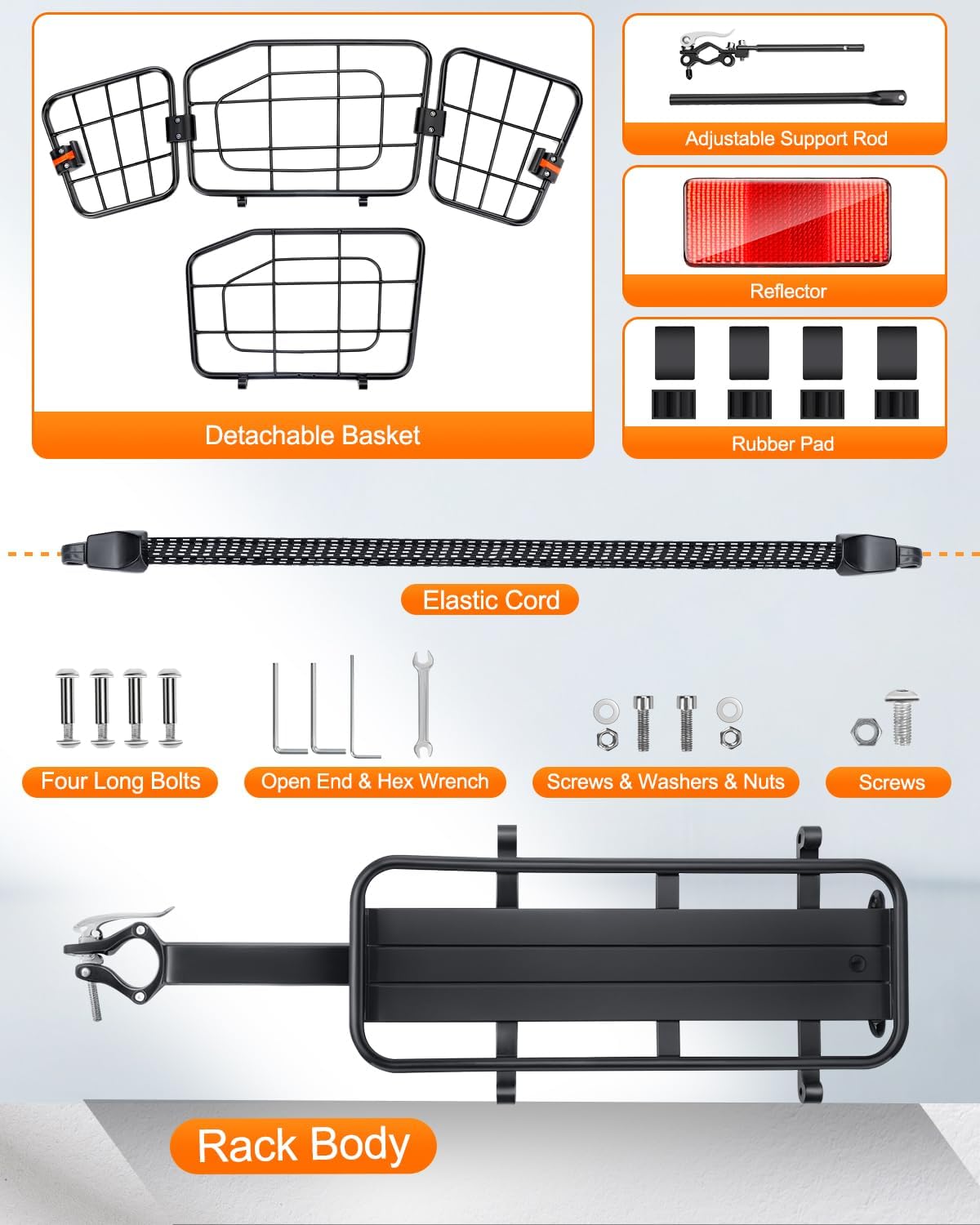 Rear Bike Rack with Basket, Aluminum Alloy Bike Cargo Rack, 22L Large Capacity Bicycle Basket, Foldable & Removable for Adult Bikes, Adjustable Touring Carrier Rack for Commuting and Shopping