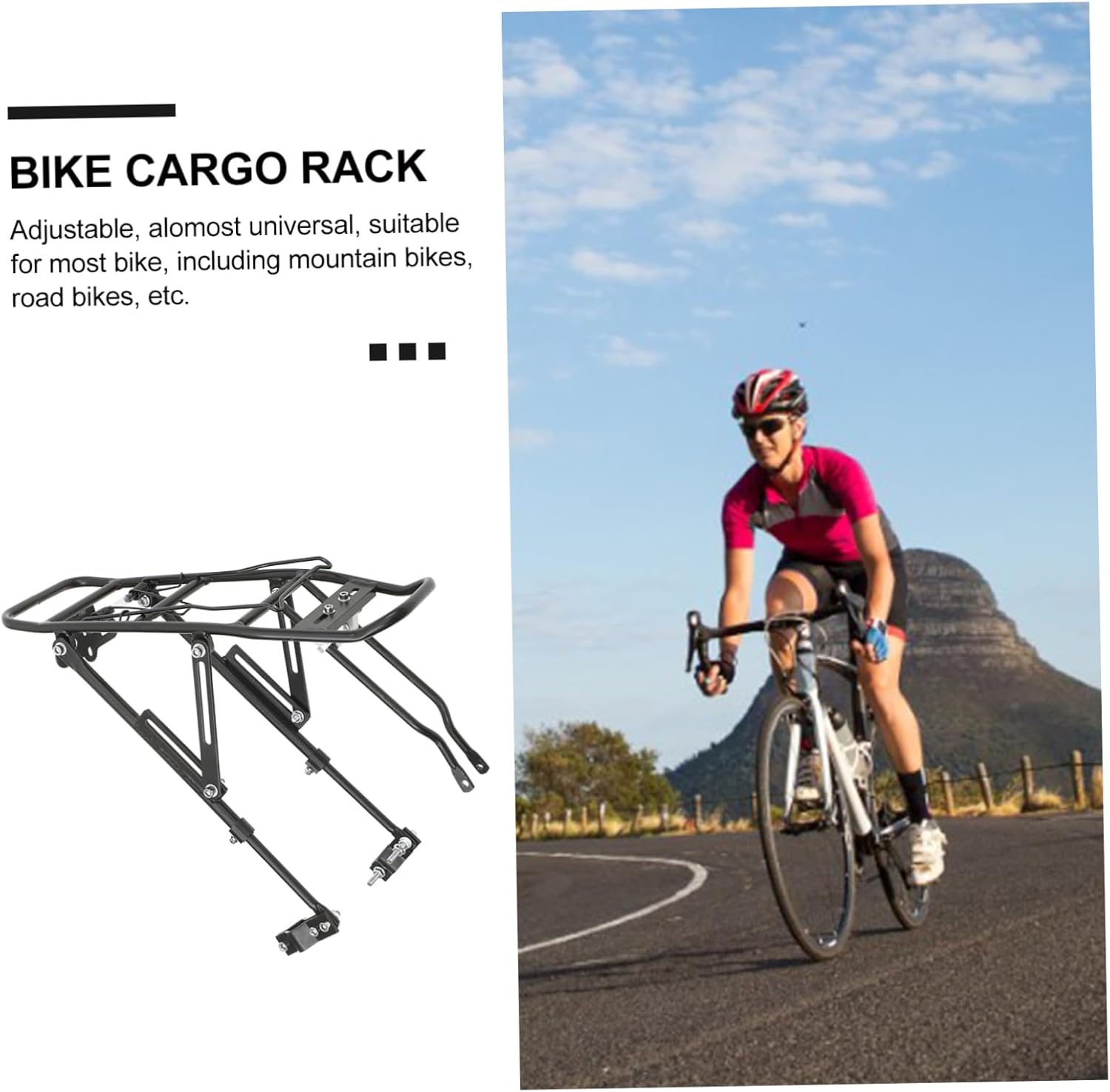 Package List 1 x Bike cargo rack Characteristics - Color: Black bike cargo rack. - Size: About 38.5x14.5x1 cm luggage rack. - Material: Aluminum alloy. - Perfect for use with panniers, backpacks, baskets, etc cargo rack. - Well made of premium and sturdy aluminum alloy, heavy-duty, durable for long hours cycling rack. - Adjustable, alomost universal, suitable for most bike, including mountain bikes, road bikes, etc rack. - Easy installation and removal rack rear.Goods Informationluggage is suitable for most bikes and for use with panniers, backpacks, baskets, etc.cycling rack A good and helpful companion for cycling!.rack Are you looking a rear cycling rack? This cargo rack might be a for you! Made of premium alloy, it is heavy-duty and durable for use