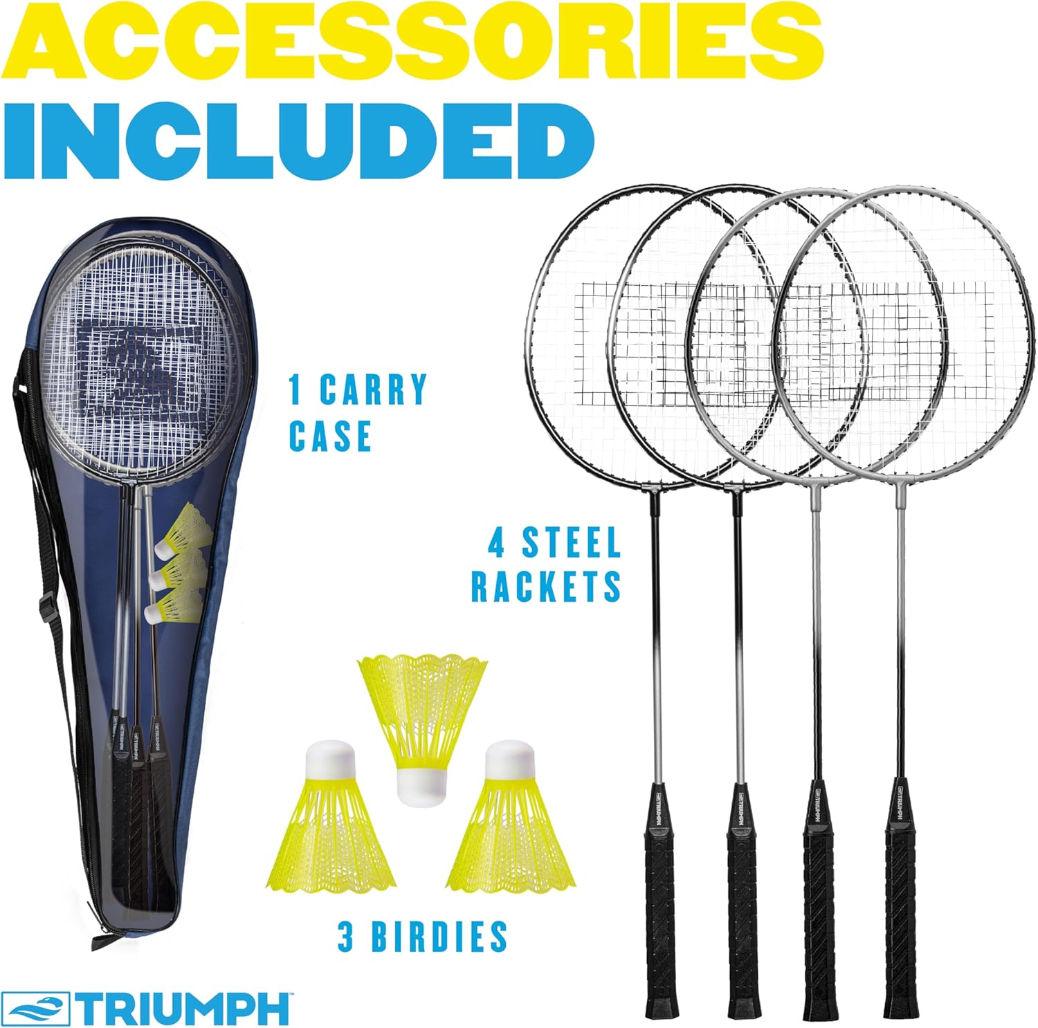 Professional badminton players need talent, skill, cat-like reflexes and world-physical fitness to stay competitive. The rest of us, however, simply need a little open space, a few good friends and the Triumph 4-Player Badminton Set. The four tempered steel rackets and three nylon shuttlecocks were made to endure a full season of smacks and strikes. With the rackets, shuttlecocks and a carry case to transport it all in included, just grab a net and you’re ready to serve it up and live it up with the Triumph 4-Player Badminton Set.