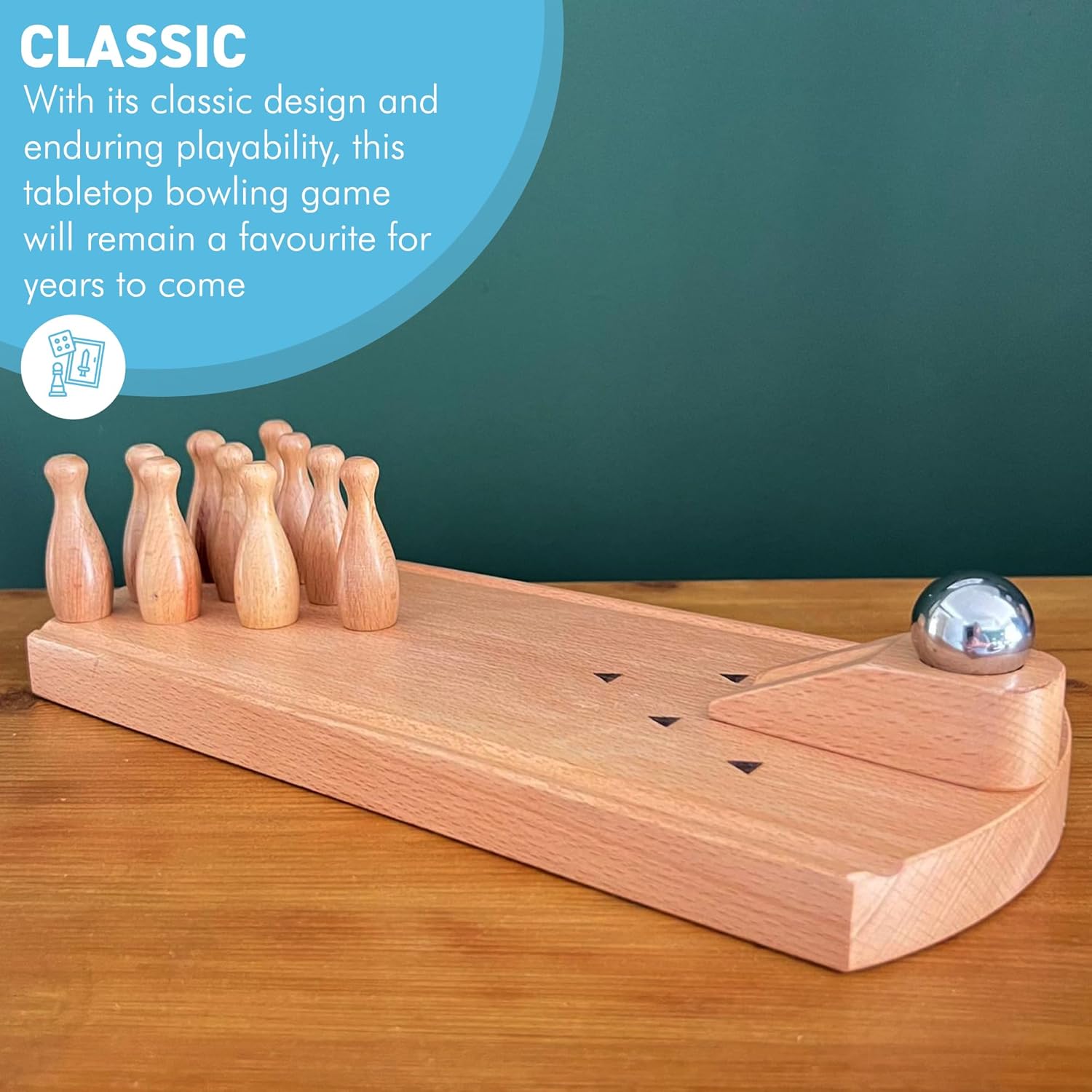 Experience the joy of a classic bowling alley right on your table with our 30cm (L) Wooden Desktop Table Top Bowling Game. This unique and compact mini bowling game is designed to bring the fun and excitement of bowling into your home, making it perfect for family game nights, parties, and friendly competitions. Crafted from high-quality wood, this desktop bowling set is both durable and aesthetically pleasing, ensuring it will be a cherished addition to your collection of games. The set includes 10 wooden bowling pins and a solid metal bowling ball, providing a realistic feel and challenge as you aim for a perfect strike. Whether you're looking to hone your skills or simply enjoy some casual fun, this tabletop bowling game is ideal for all ages. It's a fantastic family bowling game that encourages interaction and strategic thinking, making it a great way to bond with loved ones. Additionally, it serves as an engaging party games bowling option, adding a competitive edge to social gatherings. The compact size of this mini bowling game makes it easy to set up and store, allowing you to enjoy a quick game anytime, anywhere. Each roll of the metal ball down the smooth wooden lane brings a satisfying clatter of the wooden bowling pins, offering an authentic bowling experience. Whether you're aiming for strikes, spares, or just enjoying the process of knocking down pins, this fun bowling set delivers endless entertainment. It's not just a game but also a decorative piece that can add a touch of charm to your home or office. The desktop bowling set is designed to be easy to use, with straightforward rules that make it accessible to players of all skill levels. The wooden desktop bowling game is more than just a pastime; it's a strategy bowling game that challenges players to think about their moves, angles, and force applied, enhancing their hand-eye coordination and planning abilities. As a versatile and engaging activity, this tabletop bowling game is perfect for solo play, head-to-head matches, or team competitions, making it a versatile addition to any game collection. Whether you're hosting a party, spending quality time with family, or looking for a fun way to unwind, this 30cm wooden desktop bowling game is your go-to choice for entertainment. Its classic design and durable construction ensure that it will be a favorite for years to come. So, gather your friends and family, set up the pins, and get ready to experience the thrill of bowling in the comfort of your home with this delightful and engaging desktop bowling set.