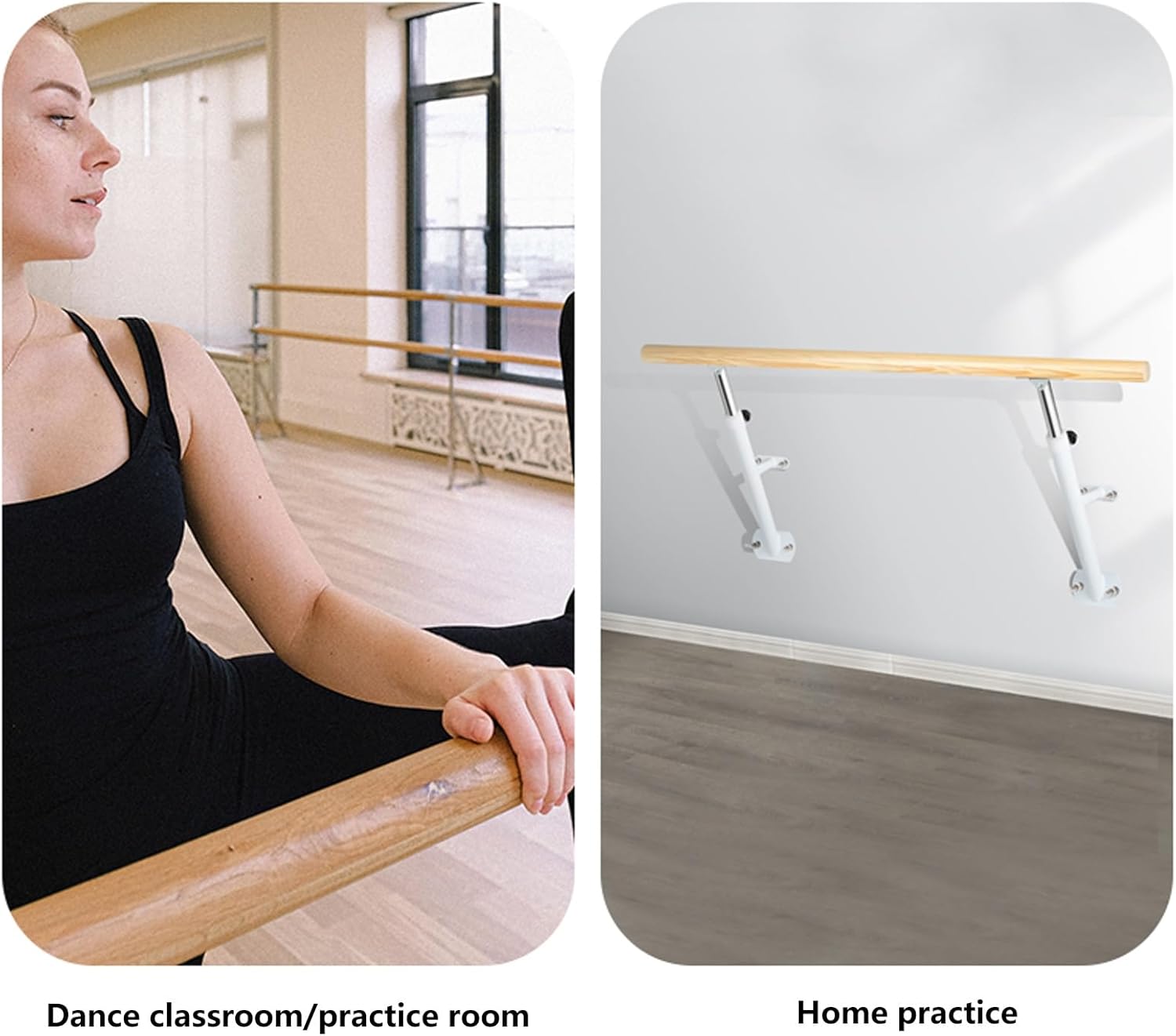 The wall-mounted ballet barre can save space to the greatest extent while ensuring stability. Size: 100 cm (39.37 inches), 150 cm (59.06 inches) Material: Solid wood/metal bracket Height: Adjustable between 80-120 cm (31-45 inches) Weight: About 10 kg (22.05 ib), 12 kg (26.46 ib) ?? Suitable for adults, children, dancers, athletes and fitness enthusiasts. ?? High-quality ballet poles suitable for homes, schools, dance classrooms, gyms, yoga studios, and practice rooms. ?? The height of the lifting rod can be adjusted by rotating the safety knob, which can better adapt to dancers of all ages and heights. ?? Our dance sticks can help you maintain your balance during practice, make your movements more standardized, and achieve better practice results. When not practicing, it can also be used as a drying rack. Note: This type of ballet barre needs to be punched and installed. Please pay attention to the position of the punch and install it on the load-bearing wall. 1. Due to manual measurement, the product may have an error of 1-2CM, please understand