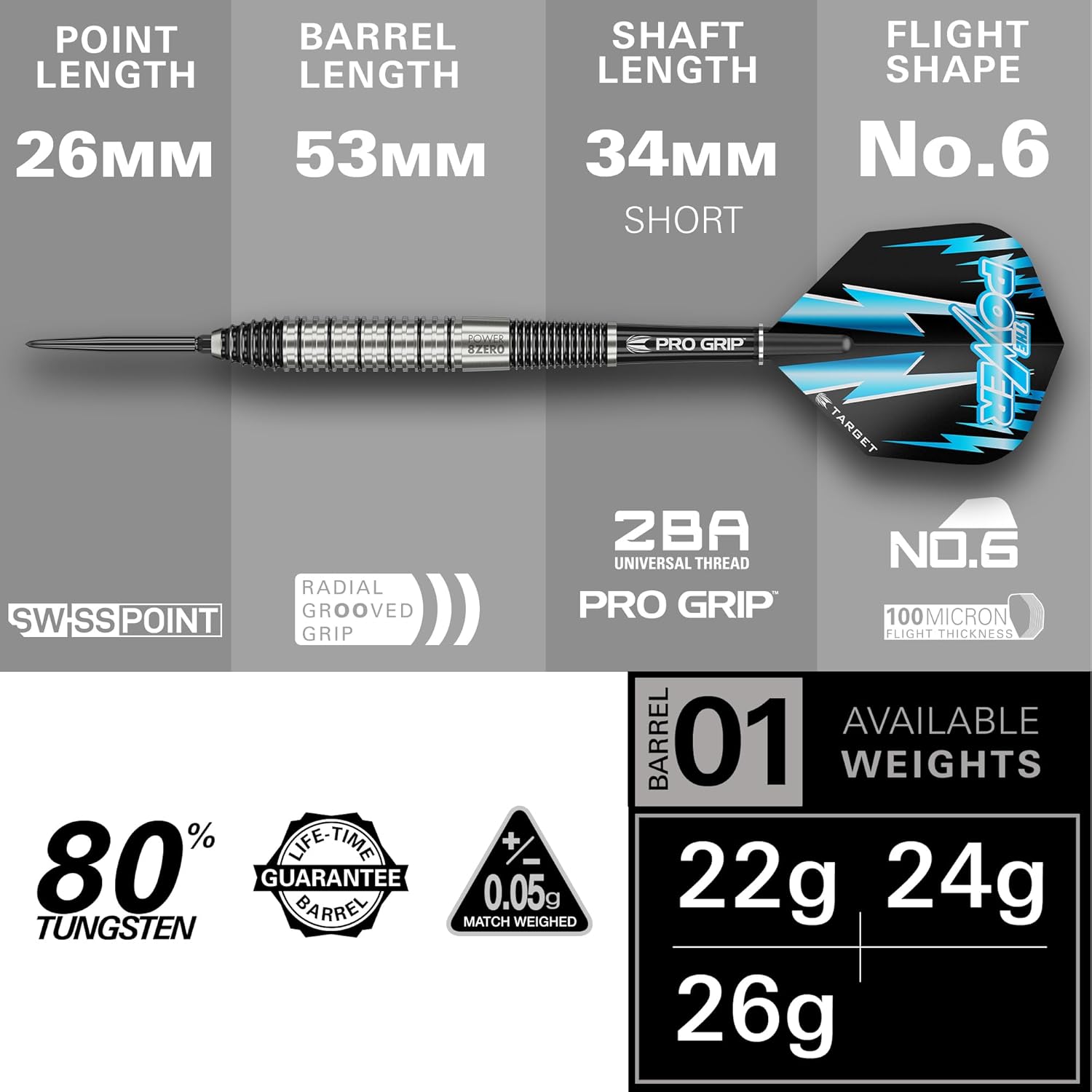 | Included Components | 3x 80% Tungsten Barrels, 3x Black Swiss Points (26mm), 3x Black Pro Grip Shafts (Short, 34mm), 3x Power 8-Zero Vision No.6 Flights, 1x Swiss Point Tool, 1x Bar Darts Wallet, and 1x 1 Month DartCounter App Subscription. |