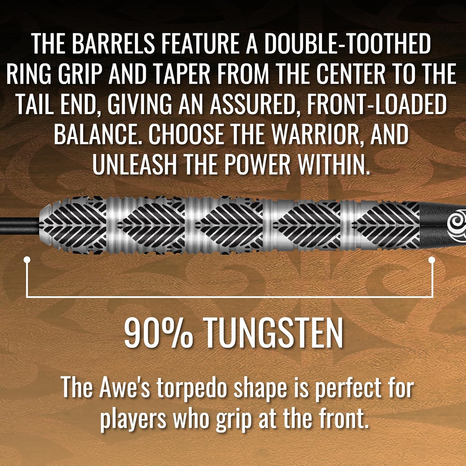 Awe describes the feathered, tufted decoration on a taiaha's collar, a weapon Māori have crafted over the generations. Signifying strength, power, and influence, Shot commissioned master carver Whare Thompson to design this stunning Awe, with its tattoo sleeve that wraps around the dart, finely laser etched. The barrels feature a double-toothed ring grip and taper from the center to the tail end, giving an assured, front-loaded balance. Choose the Warrior, and unleash the power within.