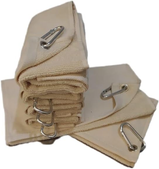 11''x18'' 100% Turkish supreme cotton high quality terry velour golf towels in beige . These towels have a corner grommet ideal for use in golf courses, easy to hang. One side of towel is velour for easy embroidery and printing if you like personalize your golf towels