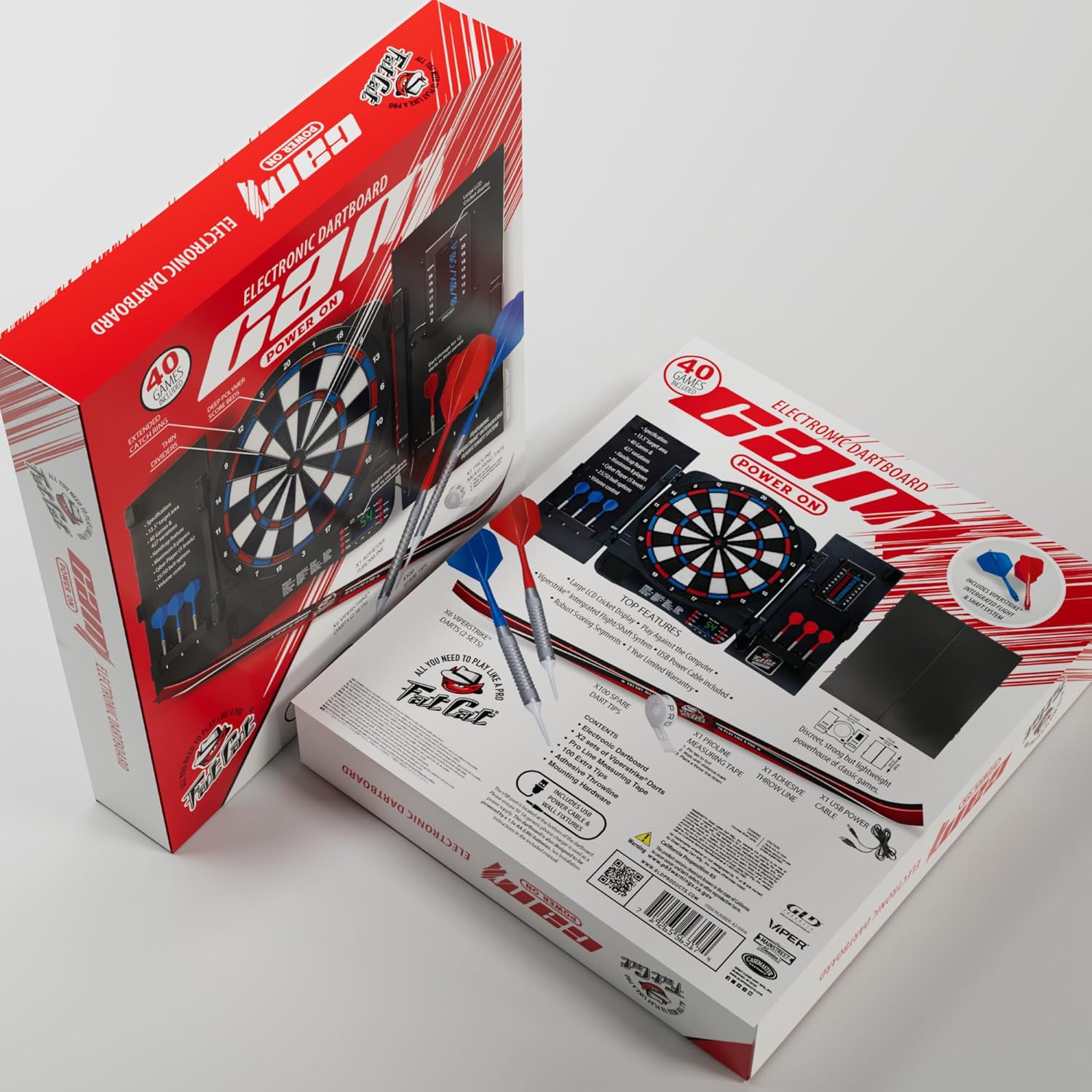 Who This Is For The Fat Cat Cam is designed for families and groups looking for an electronic dart board with cabinet that delivers hours of entertainment. Whether you're hosting game nights with friends, setting up a basement rec room, or looking for dart boards for adults that the whole family can enjoy, this 13.5 inch soft tip dart board provides safe, competitive fun without the sharp steel tips. The built-in cabinet design gives it a clean, finished look that fits any game room decor. How to Use Mount the dart board with cabinet using the included mounting hardware. Connect the USB power cable to power on the LCD display. Select from 40 programmed games with 427 scoring variations using the easy-to-navigate controls. The electronic dartboard automatically calculates and displays scores for up to 8 players, so you can focus on your throws instead of math. Use the included throw line and measuring tape to set up regulation distance. What's Included This complete electric dart board set includes 6 starter soft tip darts, extra replacement tips, mounting hardware, throw line, throw line measuring tape, USB power cable, and a comprehensive game manual. Everything you need to start playing right out of the box. Game Options With 40 games and over 427 scoring variations, the Fat Cat Cam offers something for everyone. Play classic 01 games (301, 501, 701) or Cricket, or explore unique Fat Cat exclusive variants. The LCD Cricket display makes it easy to track marks and points at a glance. Product Dimensions 19 in L x 16.5 in W x 3 in H | Weight: 7.5 lbs | Target Face: 13.5 inches