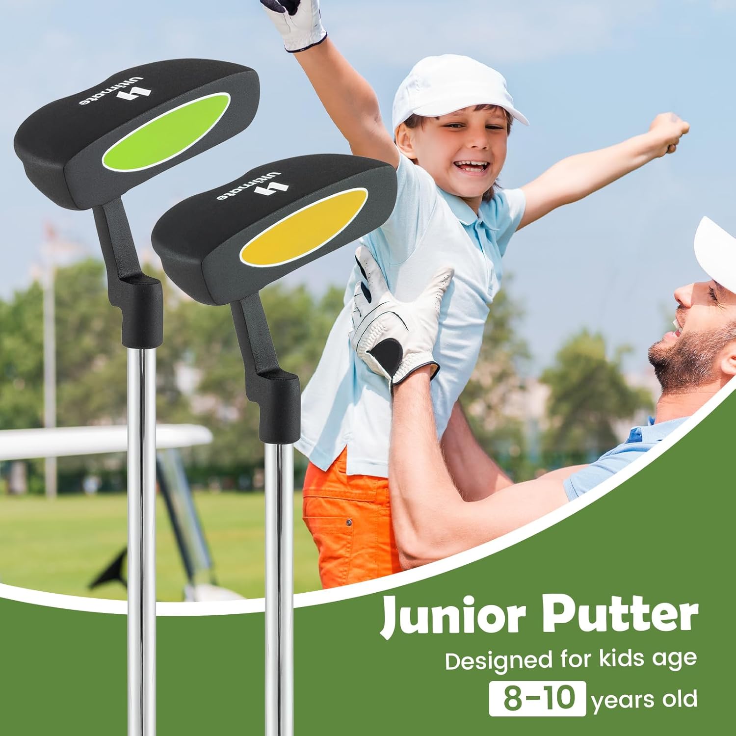 Description:Designed for young golfers, this junior putter is the perfect fit for developing putting skills and confidence on the green. The mallet style putter features an zinc alloy head for stability and alignment lines for accurate putting. With a sturdy stainless steel shaft for durability, and a non-slip rubber grip for superior handling and comfort, this putter ensures an enjoyable playing experience. It also comes with a matching head cover for protection and easy transport, keeping the club in top condition.Features:Sized and weighted for kids to playBuilt with a lightweight zinc alloy club headLarge sweet spot for high forgivenessLow center of gravity design for more stable, consistent puttsIntegrated with alignment aid for higher accuracyMade with a robust stainless steel shaftSecure holding with non-slip rubber gripIncluded head cover can protect the golf club head from damage Perfect gift for your players aged 8-10 years oldSpecifications:Color: Green/YellowMaterial of Club Head: Zinc AlloyMaterial of Shaft: Stainless SteelMaterial of Grip: RubberLie: 72°Loft: 3°Length: 27"Head Weight: 273 gGrip Weight: 46 gShaft Weight: 80 gAvailability: RHSuitable Age: 8-10 years oldPackage includes:1 x Junior Putter1 x Head Cover