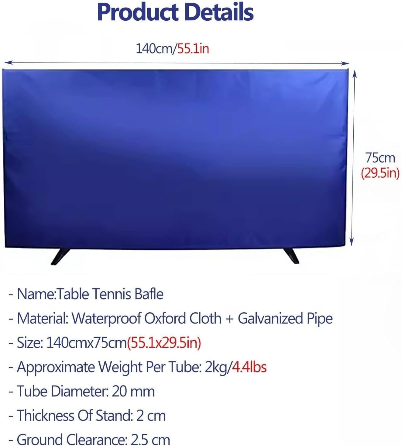 Specification:- Name: Table tennis baffle- Material: Oxford Cloth + Galvanized Pipe- Dimensions: Width x Height (140cm x 75cm) / 55x29 inches- Approximate Weight Per Tube: 2kg/4.4lbs- Tube Diameter: 20 mm- Thickness of Stand: 2 cm- Ground Clearance: 2.5 cm- Installation Method: Assembly- Advantages: Foldable & SplicableIncluded:- Table Tennis Baffle