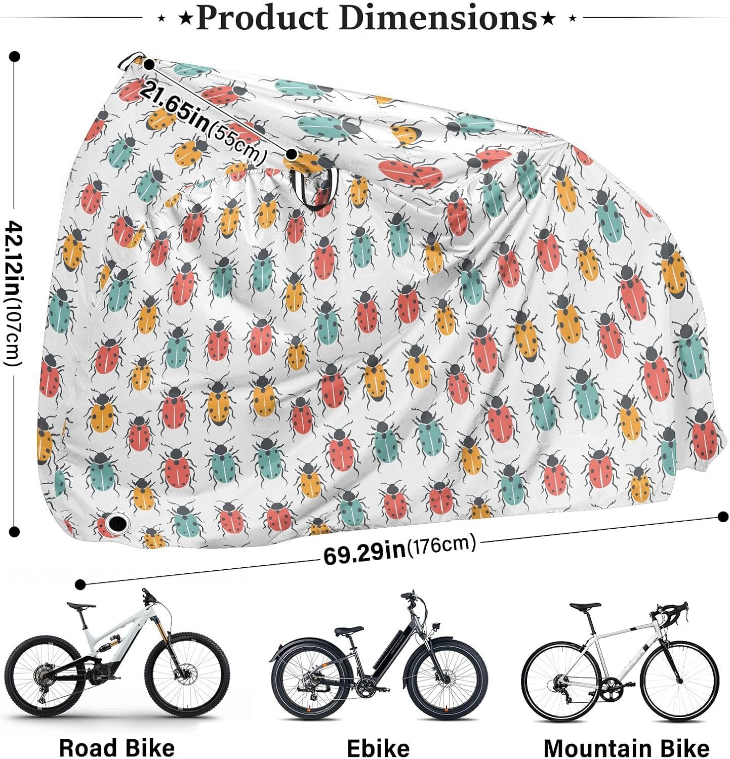 Protect your bicycle in style with our premium bike tarp, engineered for maximum defense against harsh elements. Unlike basic covers, we use specially engineered umbrella waterproof fabric - the same advanced material used in high-end rain umbrellas - delivering superior performance with unique visual appeal. Sun & Heat Defense Our fabric creates a physical cooling barrier that actively lowers your bike's temperature by: Blocking 95%+ harmful UV rays to prevent paint fading Providing exceptional shading & heat insulation (up to 20℉/11℃ reduction vs direct sun) Offering SPF 50+ equivalent protection for sensitive components Rain & Dust Protection Water-repellent coating causes rain to bead and roll off Tightly woven fabric acts as dustproof barrier for long-term storage Prevents moisture buildup with breathable side panels (prevents condensation) User-Focused Design LOCK ACCESS HOLE at front wheel enables secure locking without removing cover ADJUSTABLE BUCKLE STRAP at rear wheel anchors cover during strong winds Reflective safety strips on handles enhance nighttime visibility Ultra-lightweight (23 oz) folds into included pouch Unbeatable Aesthetics Choose from over 1,000 designer patterns - from sleek geometrics to vibrant nature motifs - transforming your bike into a street-style statement while competitors offer only solid colors.