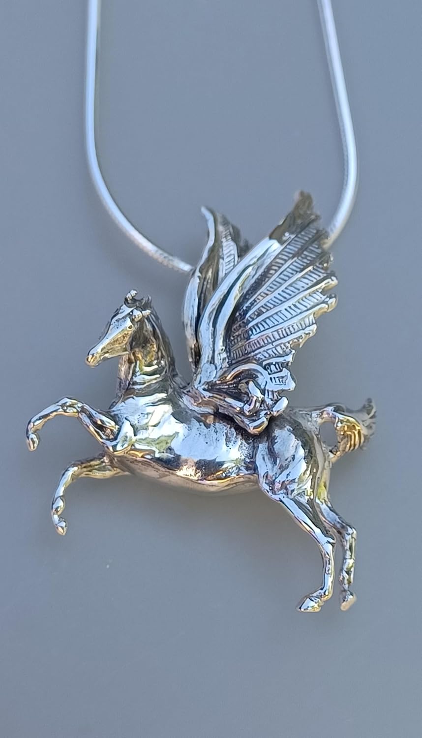 FORGE HILL SCULPTURE, horse and animal jewelry designs by Beverly Zimmer. For over 34 years, offering the most realistic, incredibly detailed, and cleverly designed jewelry pieces. All of my jewelry is truly handmade in the USA. If there is an area for a signature, each pendant is individually signed while it is still in the wax stage. This little gesture ensures authenticity and makes each piece extra special. Design by Beverly Zimmer 2024 FORGE HILL SCULPTURE Cast in Sterling silver. Hand finished. Gift box included. WOW, three dimensional Pegasus with huge wings, like a miniature sculpture! This striking pendant measures over 1.50 high and 1.25" long! It comes with an 18" silver chain with a heavy lobster claw clasp. Absolutely pristine carving. It has a bracket cast onto the back for sliding along the chain. Very Three Dimensional, hollowed out on the back to allow the chain to pass through. Signed by me in the body cavity on the back. 18" chain! The sterling silver chain is a fancy 8 sided snake chain, which has a cut to it that makes it extra shiny. It is also treated so it won't tarnish! Made in the USA Forge Hill Sculpture offers fine jewelry realistically priced. There is NO middleman, and each precious metal piece comes directly from the studio. You are buying from the original designer. Considering the weight, quality, and workmanship, I offer the very best prices on sterling silver jewelry. I do not buy and resell jewelry claiming to make it. These are truly handmade pieces. The metal finishing is all done by me, and even before the pendants are cast in silver, I clean and rework the waxes, adding detail and an original signature. That's what makes each piece unique and special. Old school quality and hands on creation.
