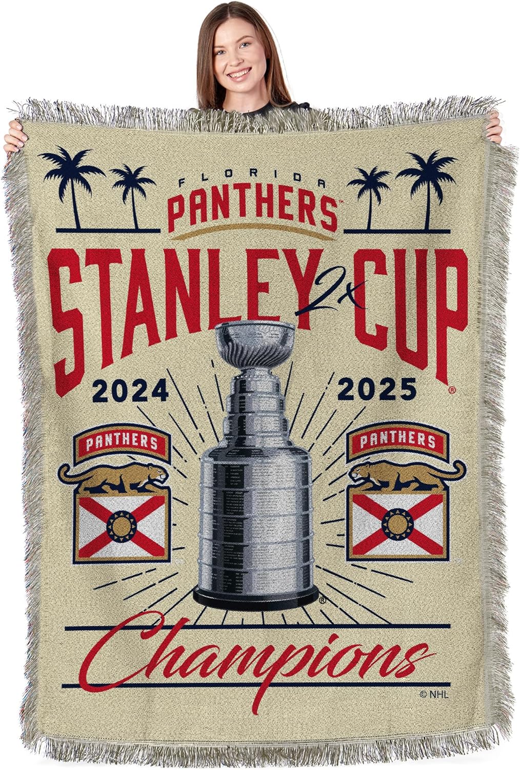Celebrate the Florida Panthers' back-to-back Stanley Cup victories with this officially licensed 2024–2025 Champions Woven Tapestry Throw Blanket. This standout piece features a bold, woven design with the iconic Stanley Cup trophy, vibrant team logos, and the commemorative years, all crafted directly into the fabric for lasting color and detail. Made in the USA from heavyweight jacquard polyester, the blanket offers exceptional durability and a richly textured feel, while decorative fringed edges and classic team colors add a timeless touch to any space. Measuring 48 x 60 inches, this versatile throw is perfect for draping over your sofa, displaying on a wall, or keeping cozy during game nights. The blanket is easy to care for—simply machine wash cold on a delicate cycle and lay flat to dry—so you can enjoy its comfort and vibrant look for years to come. Whether you're commemorating a legendary season, upgrading your fan cave, or searching for the perfect gift for a Panthers supporter, this NHL Champions tapestry throw is a must-have tribute to hockey greatness.