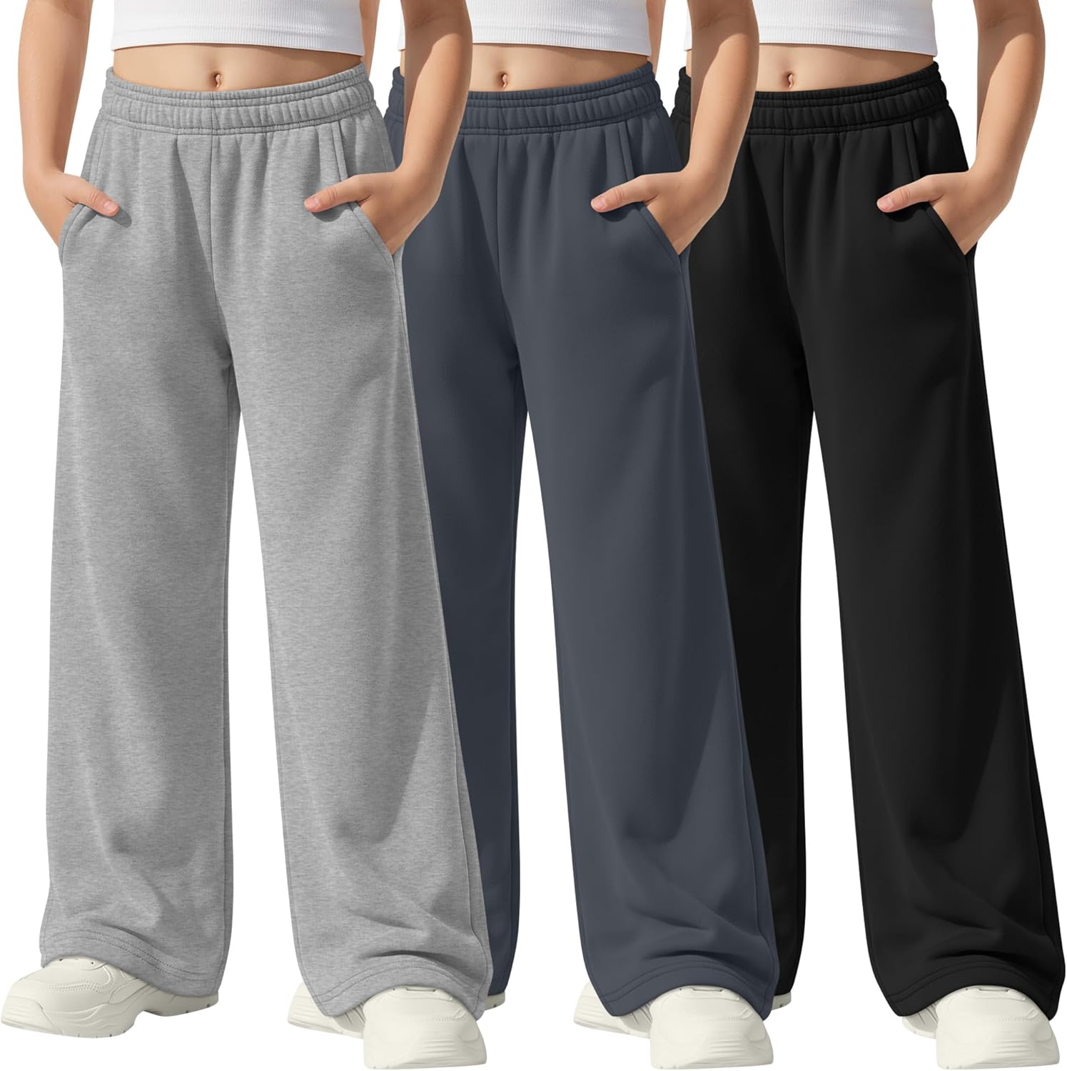 Features: Details about the cut and design: The straight leg sweatpants are designed with pockets and elastic waist, both comfortable and convenient, suit for most girls' body shape. Nice present for girls: The casual baggy joggers are suitable for girls of different ages, making it a good present for sisters, daughters or granddaughters. Specifications: Material: 60% Cotton, 35% Polyester, 5% Spandex Package includes: 3 x girls' straight leg sweatpants Notes: Manual measurement, please allow slight errors on size. The color may exist a slight difference due to different screen display. Check the size chart before purchasing, it would help you find a more accurate size for yourself. Hand/machine wash in gentle with cold water, hang to dry or line dry, do not bleach, warm iron if needed, wash dark colors separately