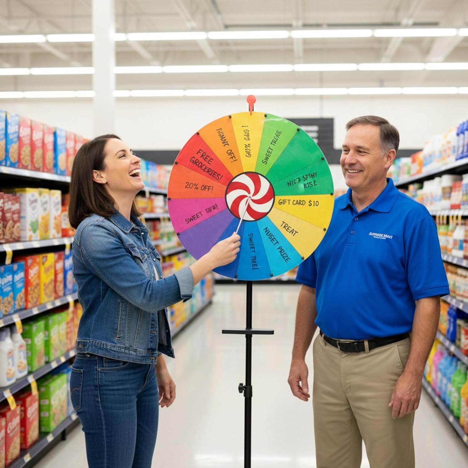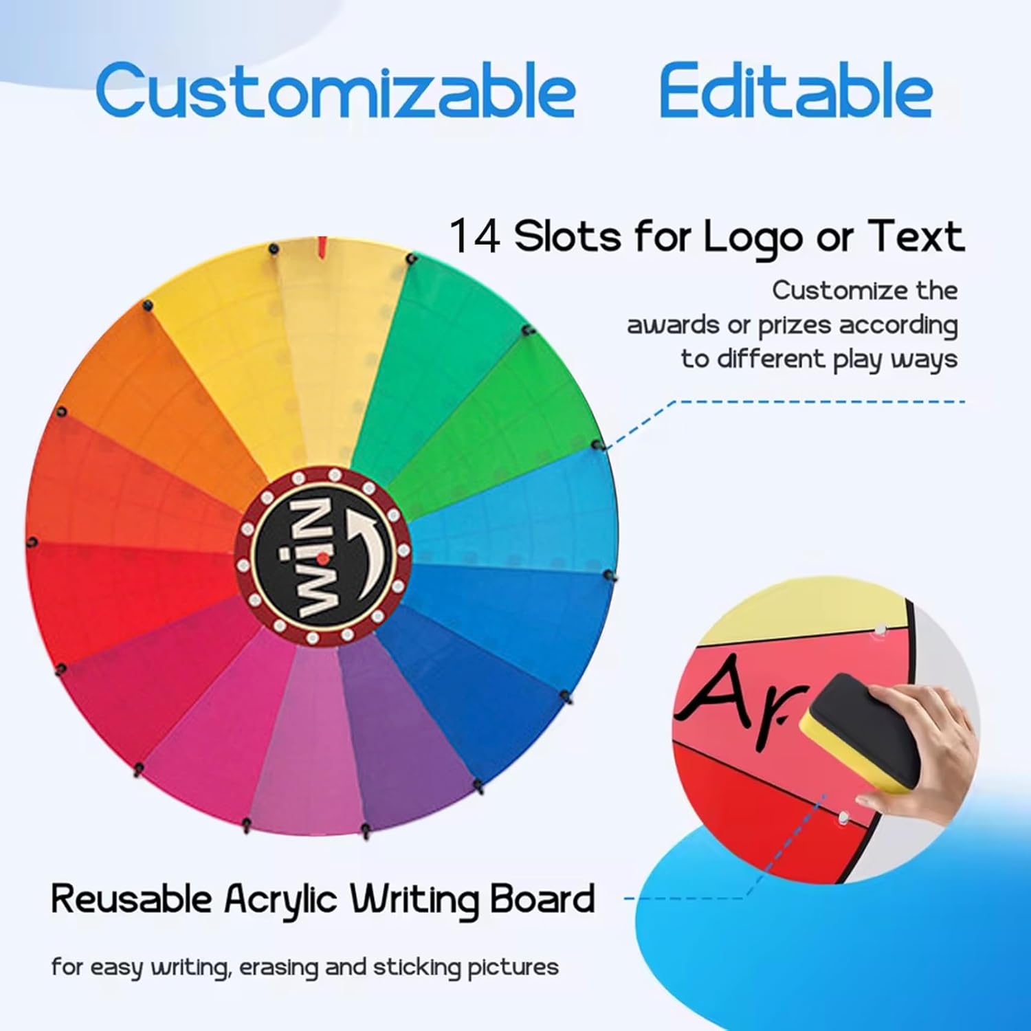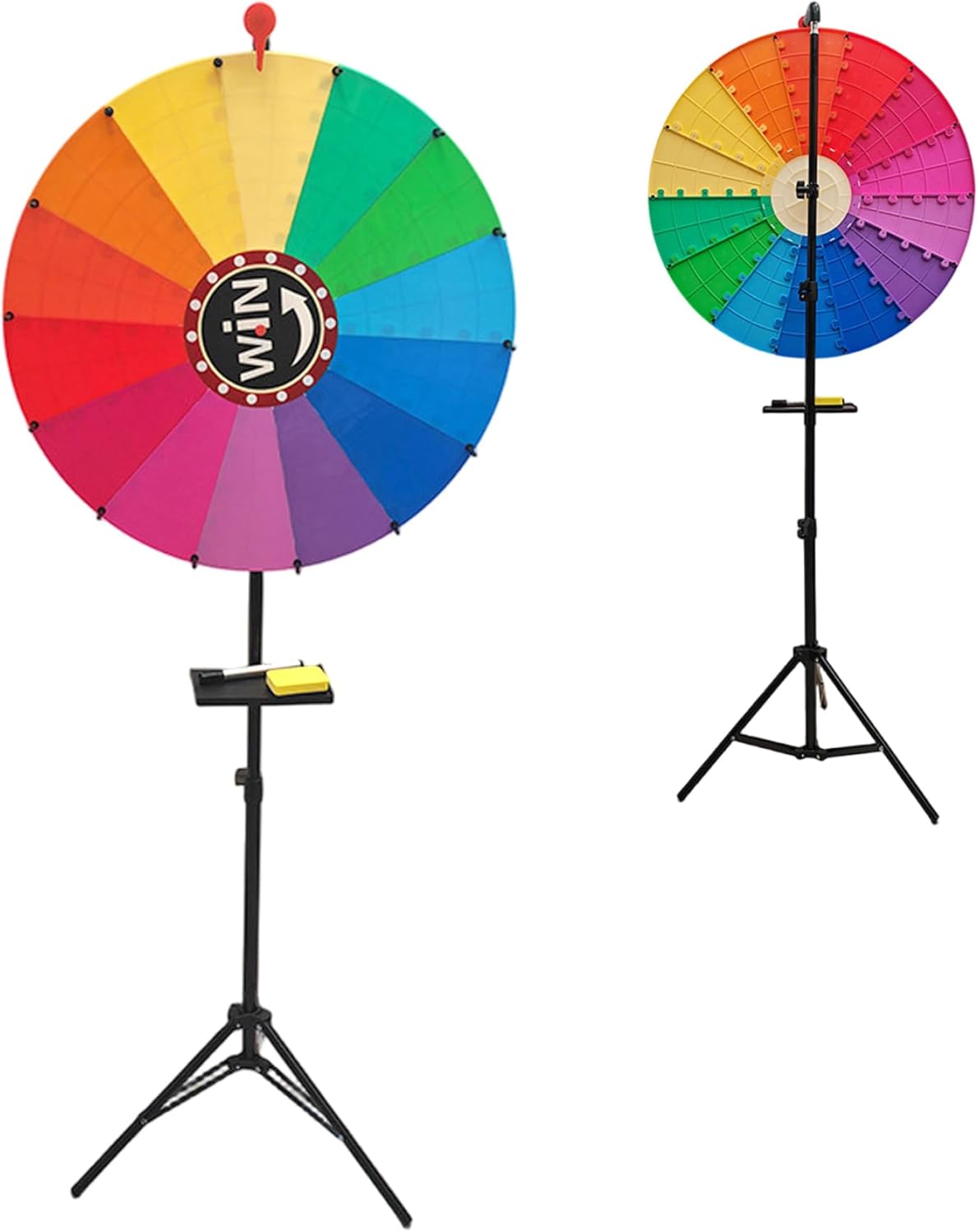 Description: This 24 Inch Prize Wheel with 14 vibrant color slots makes an engaging and visually appealing game experience suitable for both adults and kids. The adjustable tripod stand ensures stable support and customizable height for versatile placement, whether in classrooms, parties, or promotional events. Equipped with dry erase markers, an eraser, and a built-in tray, this spin the wheel game allows quick and easy customization of prize categories, enhancing interactivity and excitement. Made from sturdy materials, the spinner wheel is built to withstand frequent use while remaining lightweight for easy transport and storage. Ideal for prize giveaways, educational activities, or fun competitions, this spinning wheel promotes social interaction and joyful participation while meeting the needs of various event organizers and game facilitators. Its user-friendly design and reliable construction make it a top choice for anyone looking to add dynamic incentives and a lively atmosphere to any gathering. Features:. -Color: Colorful. -Material: Steel. -Size: 61 cm/24 inch. Adjustable Height 100-165 cm/39.4-65 inch. Note:Manual measurement, please allow slight errors on size.The colors may exist slight difference due to different screens. Package Including 1 * Prize Wheel